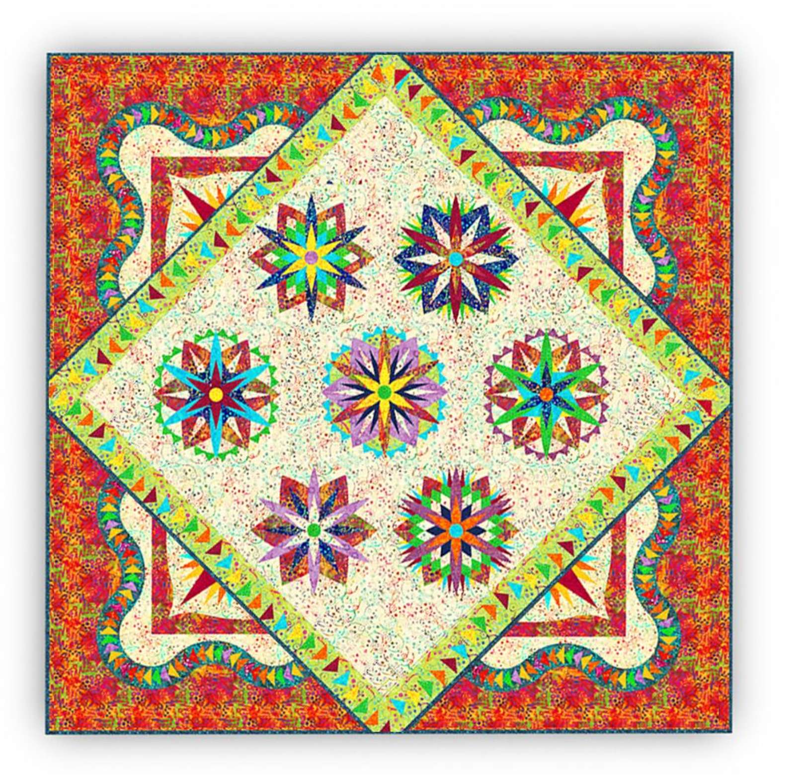 If you've always wanted to make a King Size Judy Neimeyer Star Quilt, then you have hit the jackpot! You will sharpen your paper piecing skills with this Exclusive Island Life Sampler! This stunning design, by Judy Neimeyer of Quiltworx, is separated as a block of the month, and features the Dragonfly Spell fabrics from Batik Textiles. Combined the Candy Coated Snowflakes and Flying Geese Expansion patterns from Judy to make this incredible design. Stunning and vibrant colors are the perfect match for this gorgeous design. The finished quilt is a King Size 109" x 109" square, and the design marries the Candy Coated Snowflakes Block of the Month and the Flying Geese Expansion Corner Design. While this is for the more advanced paper-piecer, as you move along with the Block of the month, your skills will sharpen and you will be able to handle the extra detailed border. The kit includes all of the fabric to complete the quilt top as shown, paper pieced templates, instructions, exclusive layout-supplement, and binding needed to complete the quilt - backing is sold separate. NOTE ABOUT THE SUPPLEMENTAL PATTERN Because the original design was modified by turning the center on point to make this a King sized quilt, you will receive the modified templates from the Quiltworx team and our supplemental write-up along with your design. This is included in the price.