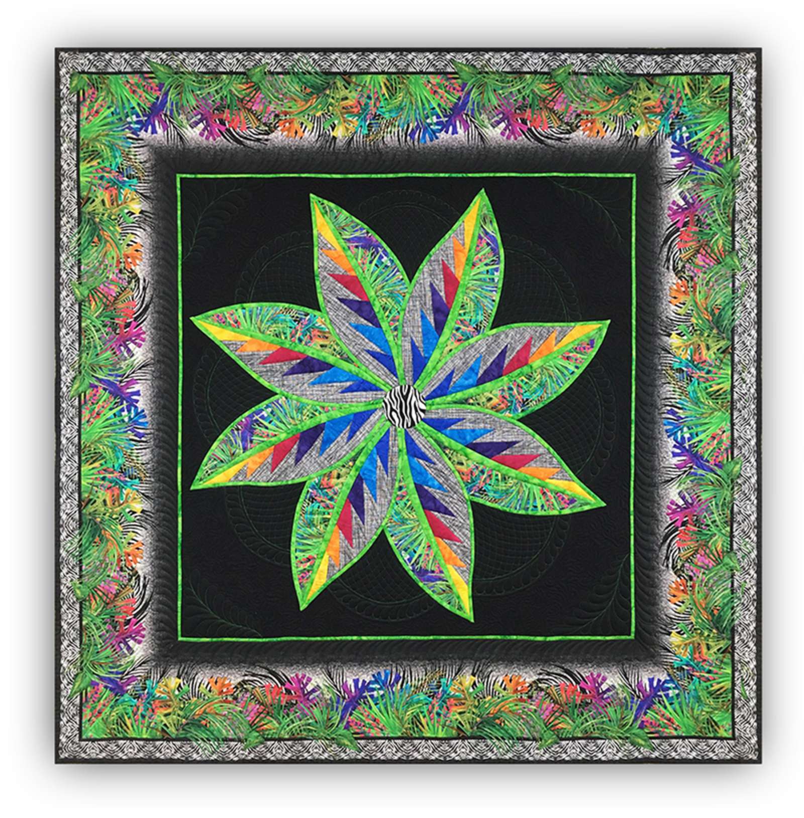 Hands down this is a customer favorite quilt. Could it be that many of us long to be in Hawaii, and this simply reminds us of the beautiful and fragrant flowers that carpet the islands? Plus, this is the perfect quilt that takes our skills to the next level - a bit of piecing, a bit of applique, and a bit of Paper Piecing -- all so you can have a perfect flower every time! This finished quilt, with the beautiful outer border, measures 57" x 57", and the quilt kit includes all of the fabric to complete the quilt top as shown, including binding, border fabric, the green silk thread for either hand or machine appliqueing the leaves, and an exclusive supplement needed for cutting and assembly of this version of the design.