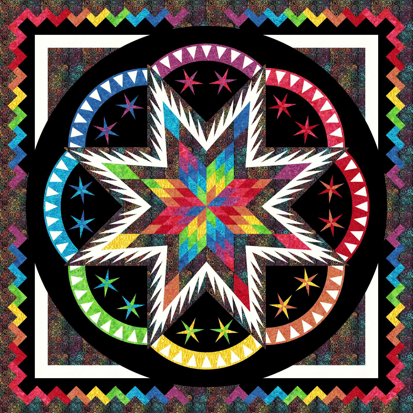 The Fortune Teller pattern was designed by Judy and Bradley Niemeyer. It includes four sections referred to as Groups A, B, G, and C, and these group sizes have been standardized so that you can use interchangeable blocks in each space. This kit includes fabric from Island Batiks. The finished quilt top measures 80"x80". Binding is also included.