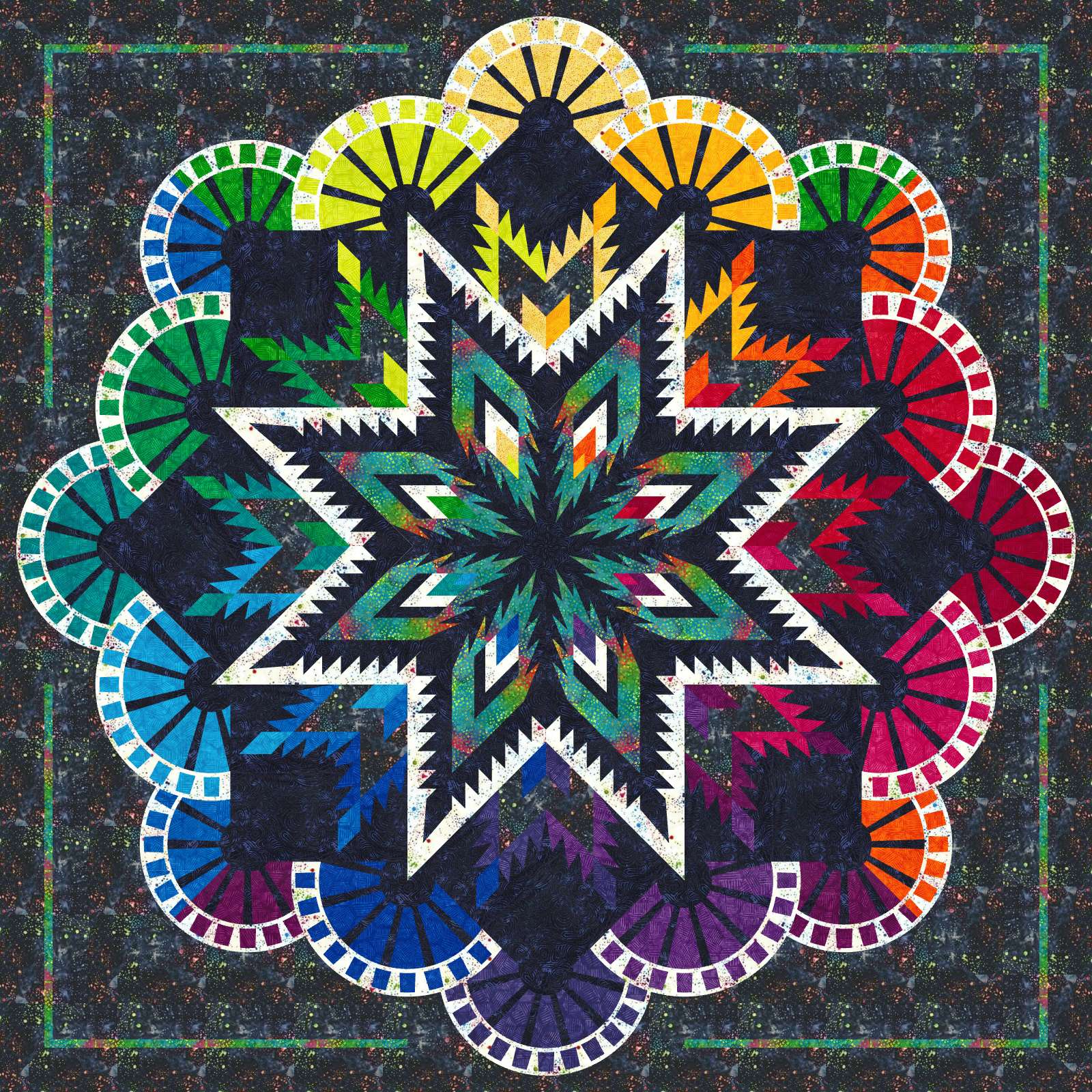 Steampunk Fairytale Kit- Color Wheel Kit includes: Fabric for quilt top including binding, and pattern depending on option selected. Finished Size: 99" sq *Note: Due to limitation in Quiltster the four corner coloring is not the way the finished quilt will look. Backing not included: need 9 1/4yd backing fabric or 3 1/4 yd of a wide backing fabric.