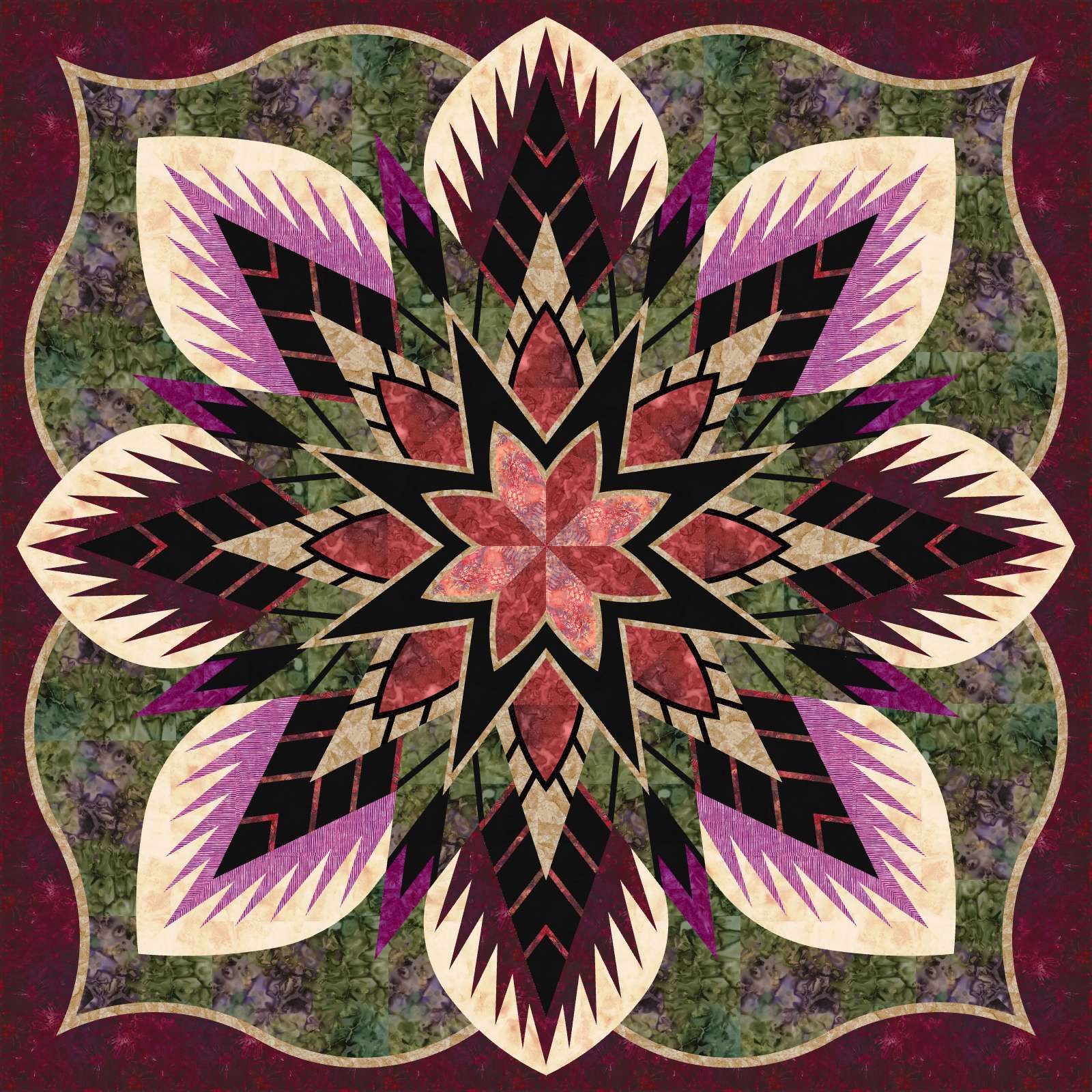 68" x 68" Wall Crimson Poppy is constructed using five distinct sections: Group J is comprised of (8) center diamonds; Groups K, L, and M radiate out from the center star in three additional rounds of (8) star points each; and Group F is a pieced border added to the rounds to result in a 68″-square quilt. The quilt blocks were designed by Judy and Bradley Niemeyer. The layout and colorway was created by Judel Niemeyer using Quiltster. This fabric kit is comprised of Hoffman Batiks.