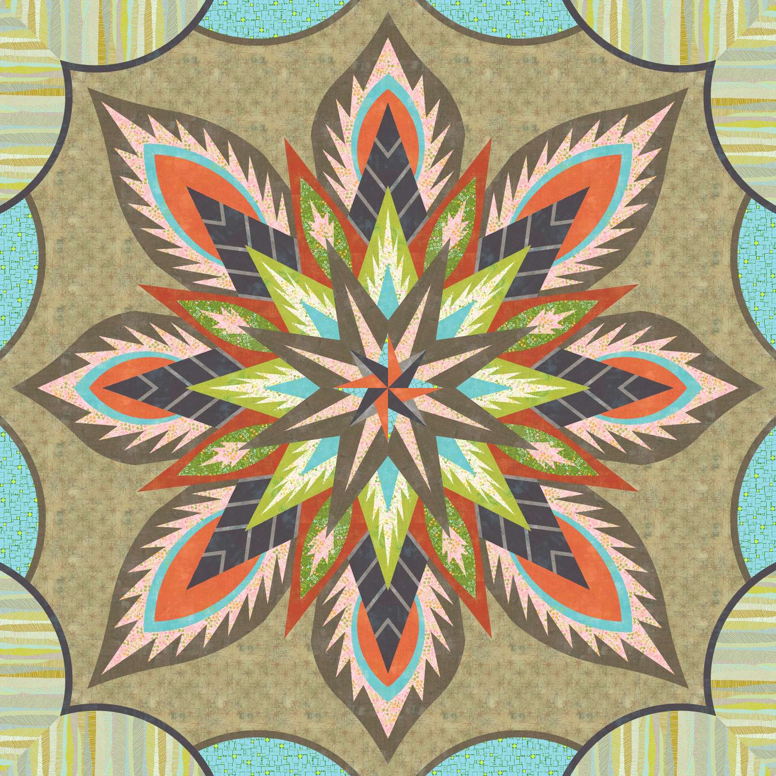 Dragon's Tail was designed in Quiltster by Last Stitch Effort and includes backing fabric matching the top's corner fabric.  This colorway does not match the pattern coversheet.  All fabrics are labeled with Quiltster-assigned codes.  You will need to use the Unit Charts to match up the fabrics instead of the tables on the back page of the pattern coversheet.