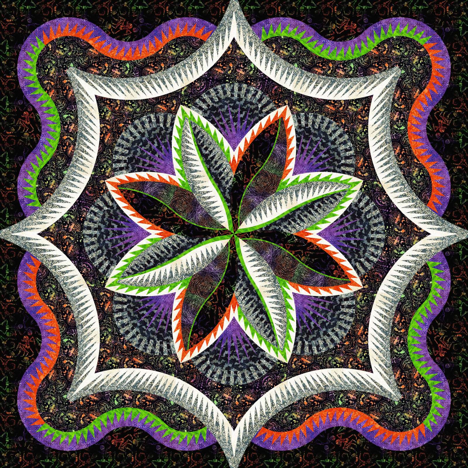 Hosta Queen Mixer is 100 x 100, designed in Quiltster by Last Stitch Effort using Halloween-themed batiks and coordinating batiks.  This kit includes purple print batik backing.  This colorway does not match the pattern coversheet.  All fabrics are labeled with Quiltster-assigned codes.  You will need to use the Unit Charts to match up the fabrics instead of the tables on the back page of the pattern coversheet.