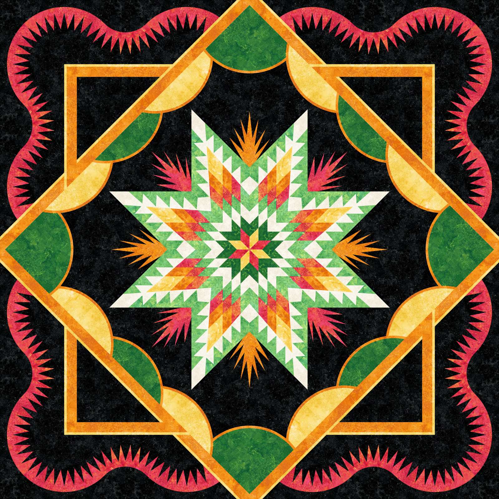 Boughs of Holly was designed in Quiltster by Last Stitch Effort using Northcott Stonehenge fabric.  This colorway does not match the pattern coversheet.  All fabrics are labeled with Quiltster-assigned codes.  You will need to use the Unit Charts to match up the fabrics instead of the tables on the back page of the pattern coversheet.