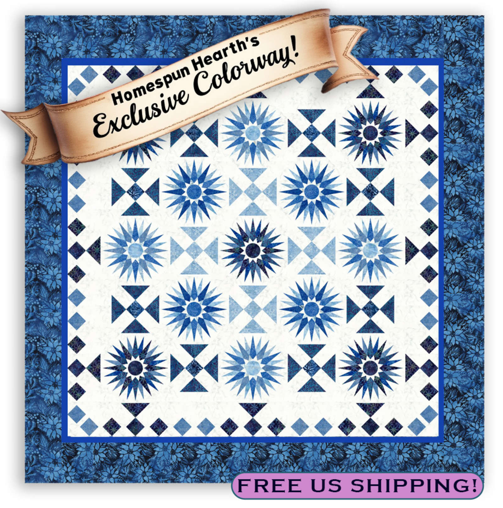 Step into a world of tranquility with the Arctic Blossom Quilt Kit. This stunning 108” square quilt features the iconic Polar Compass design enhanced with a rich outer border of delicate blue florals. Perfect for adding a refined touch to any room, Arctic Blossom combines cool blues and crisp whites to create a soothing and timeless aesthetic. This complete kit includes detailed instructions and all the fabric needed to complete the top and binding, making it an excellent choice for seasoned quilters or anyone looking to craft a breathtaking heirloom. To make this 108" square, we've added a 1 1/2" inner border and a stunning 10" Outer Border.