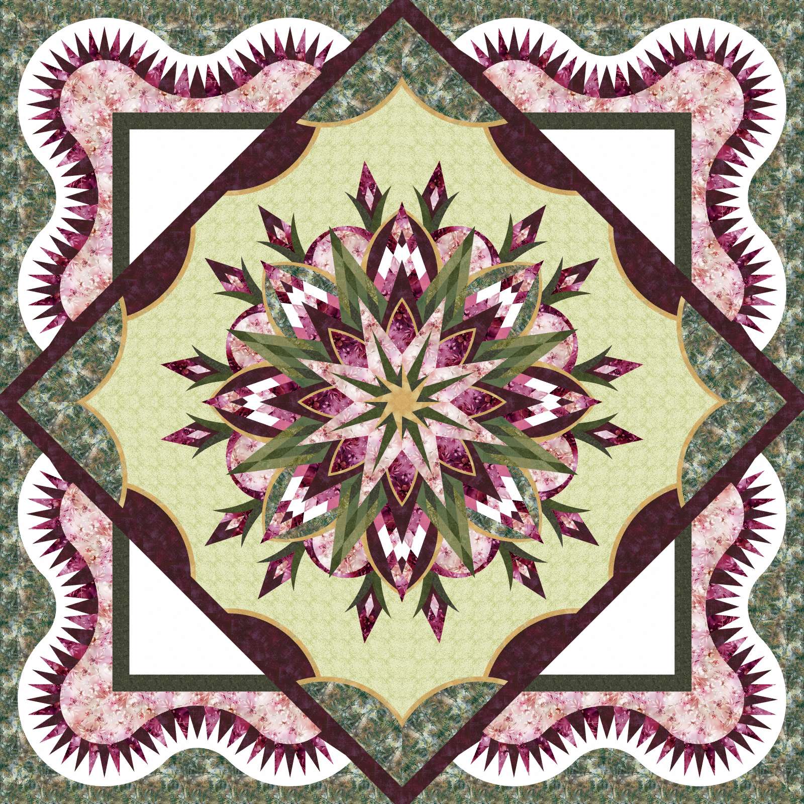 This beautiful rendition of Cabaret is stunning. The quilt is a georgous is a garden delight you will proudly display in your home. Quilt kit is 118 x 118 in size and made from Moda Grunge and Hoffman cotton fabrics. In sage greens, dusty roses, burgundy and white. Its every woman's dream. The quilt kit uses the Dragon's Tooth King expansion pattern.