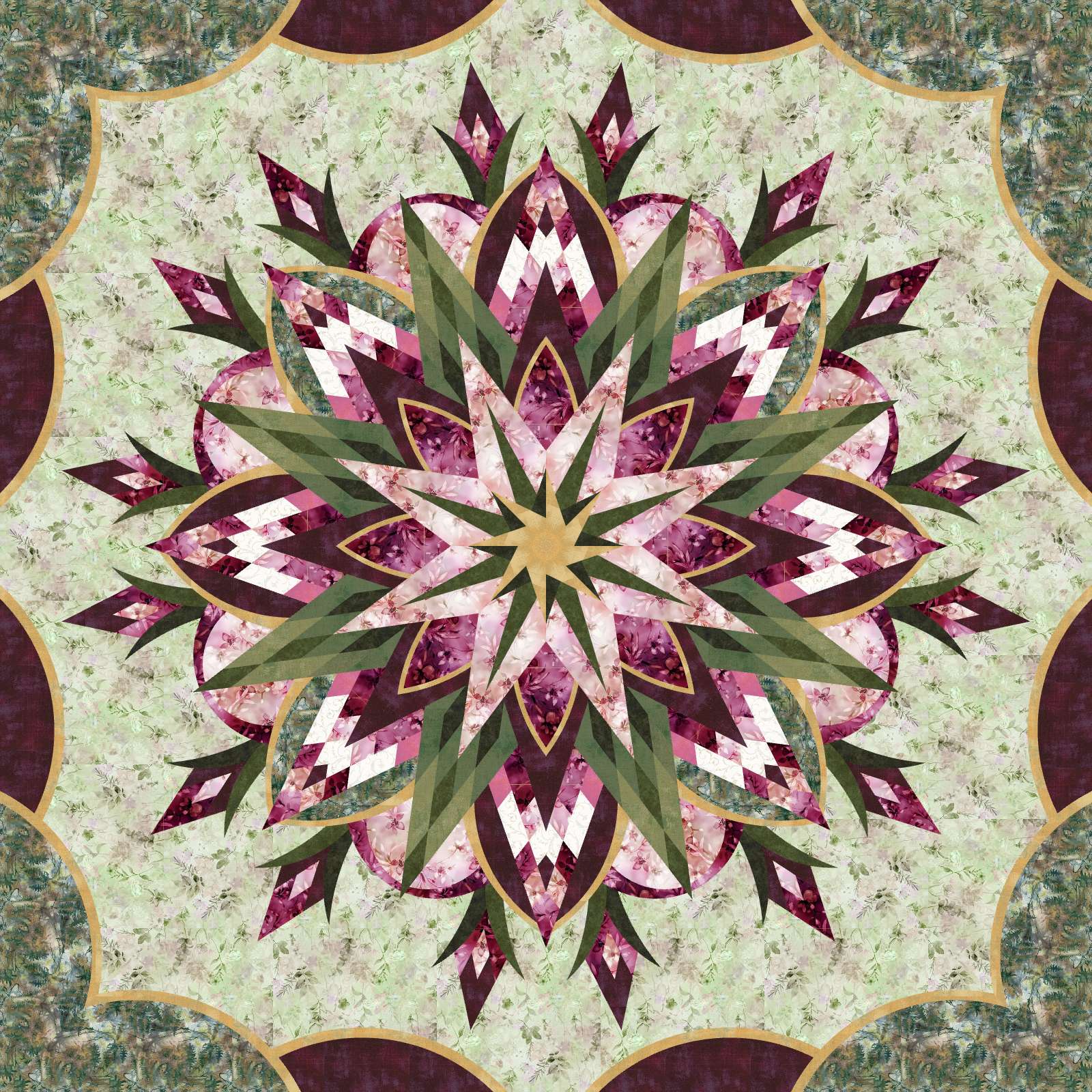 This beautiful rendition of Cabaret is stunning. The quilt is a gorgeous is a garden delight you will proudly display in your home. Quilt kit is 80 x 80 in size and made from Moda Grunge and Hoffman cotton and batiks fabrics. In sage greens, dusty roses, burgundy and white. Its every woman's dream.