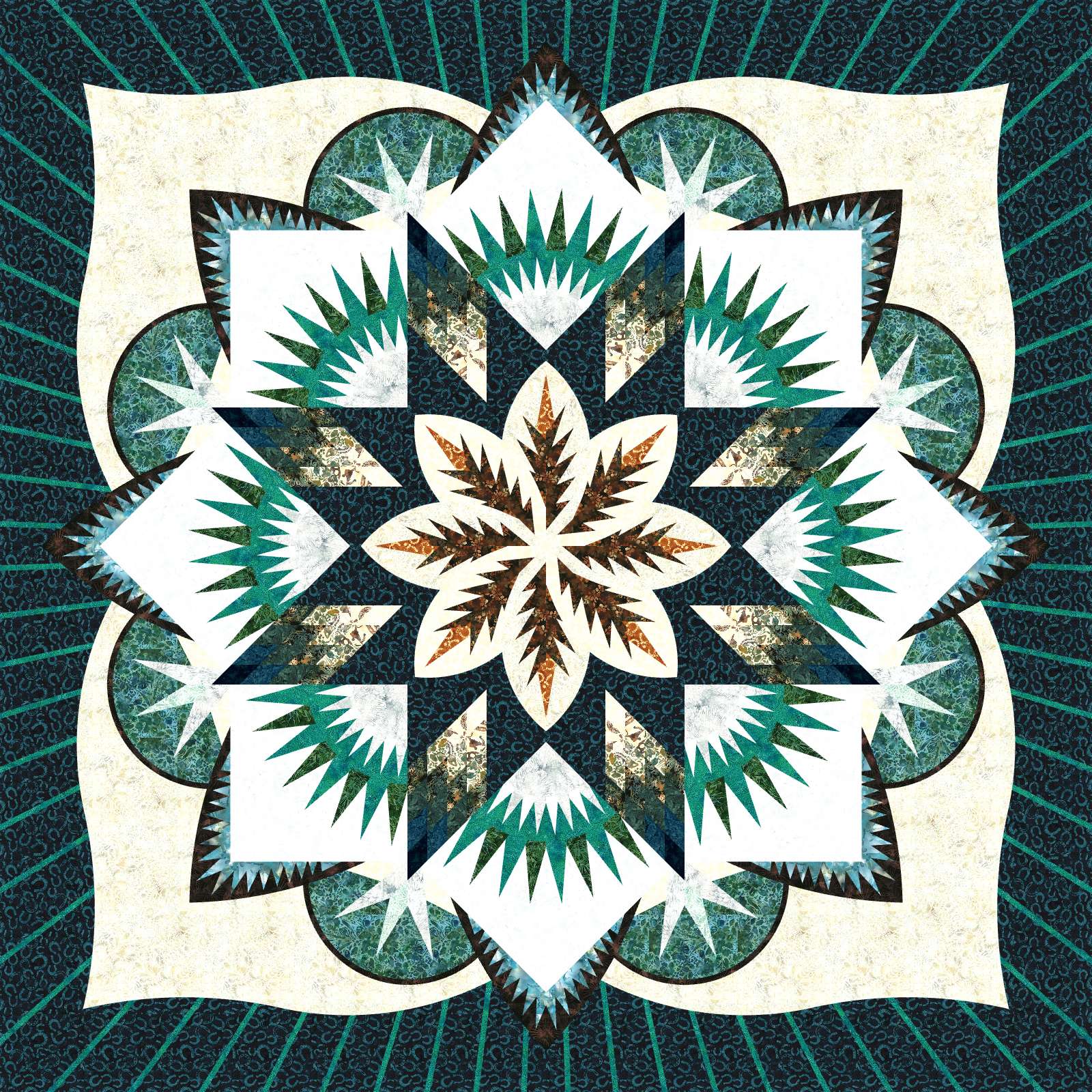 Kentucky Spirits is a foundation paper pieced pattern by Quiltworx.com. This colorway was created by Judel Niemeyer using fabrics from Hoffman Batiks released in April 2025. The collection is perfect for conjuring up Kentucky Spirits, with horse shoes, riding elements, and a collection of rich browns and teals reminiscent of Bourbon, Mint Julips, and a wonderful afternoon at the tracks. The quilt includes 22-1/2 yards of fabric, including the binding, and can be purchased with or without the pattern. The kit is compatible with all releases, but if you want one where the kitting and yardage information matches the fabrics in the kit, be sure to purchase the latest Kentucky Spirits pattern (included in kits with the pattern). If you use an older release, kitting sheets for this colorway are available on the Quiltworx Website. A Quiltster Template has also been saved out that you can save to your computer and use as you make the quilt, if you are a Quiltster subscriber.