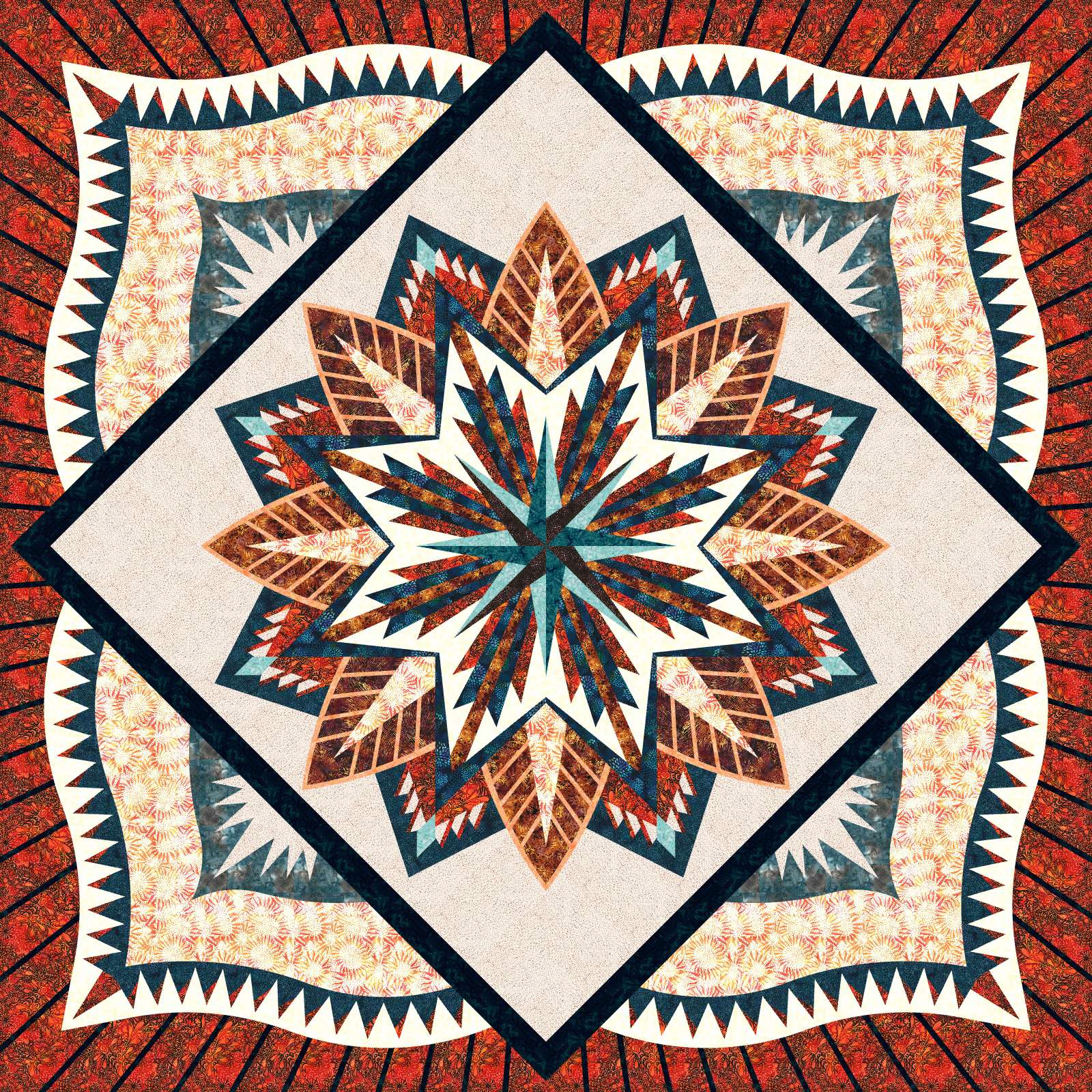 Monument Valley is a foundation paper pieced pattern by Quiltworx.com. This kit is the original Hoffman Fabrics collection that was used on the coversheets in rich warm Red Rock inspired batiks, with cactus and southwest prints. The colorway was designed by Judel Niemeyer, and the quilt has 21-5/8 yards of fabric, including the binding. It can be purchased with or without the pattern.