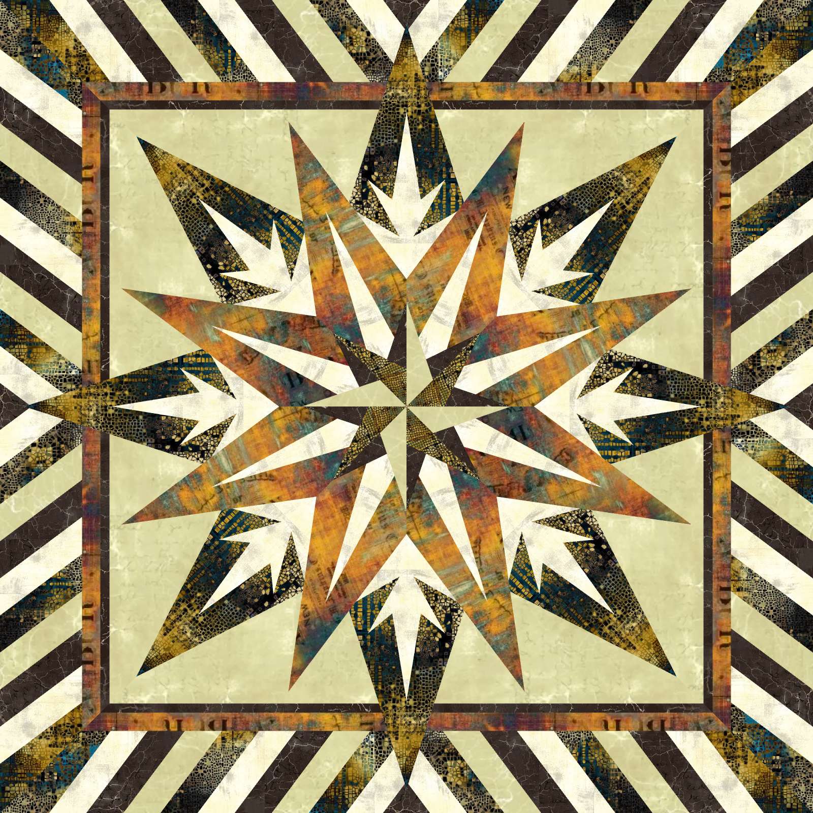 TRIFARI JEWELS is a fun beginner friendly 45” x 45” pattern from Quiltworx that goes together quickly while learning and practicing Judy Niemeyer’s foundation paper piecing techniques. There are no curved seams in this project – just varying lengths of straight seams. Your points will never be cut off, due to Judy’s design process. This pattern will also be fun for seasoned Judy Niemeyer enthusiasts that like showing off interesting color choices! The amazing Tim Holtz Abandoned fabrics lend themselves to creating interesting color and texture motifs which will appear to make the quilt much more complicated than it is!