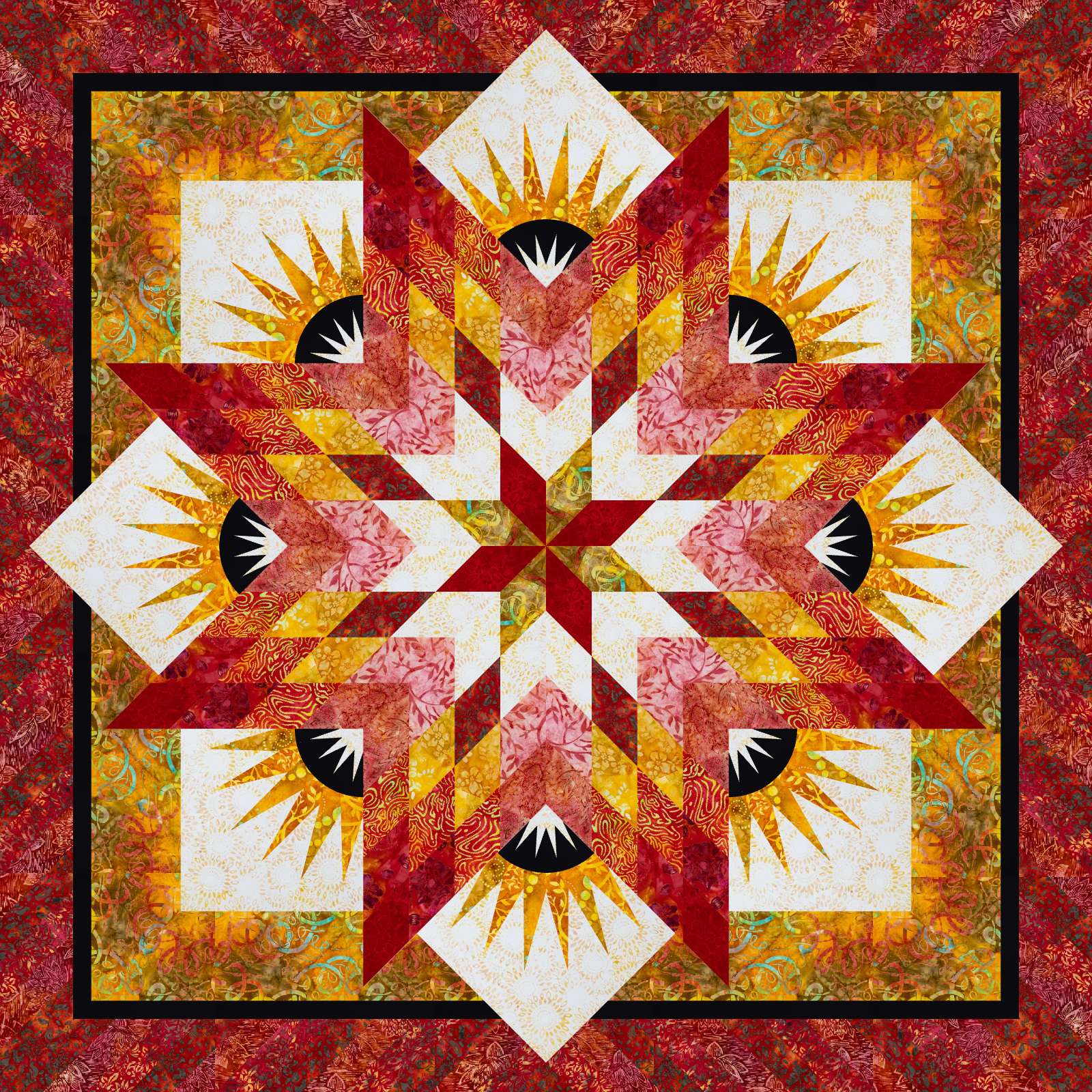 The Summer Solstice kit is a foundation paper piece pattern by Quiltworx.com. This kit was created by Judel Niemeyer in Quiltster using 8-1/8 total yards of Riley Blake's expression Batiks fabric line. This kit can be purchased with or without the binding.