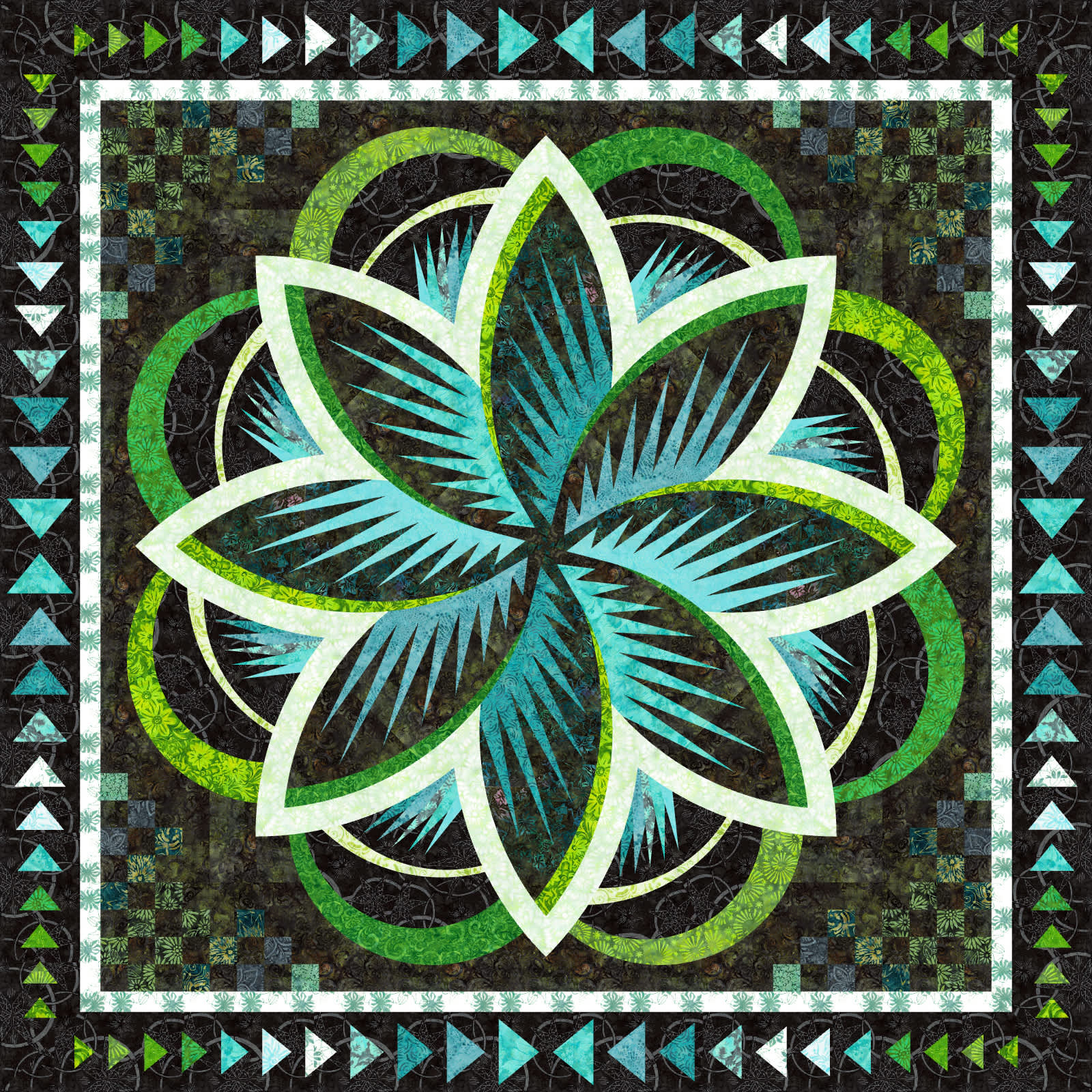The Queen of the Night in Valley Blossoms Tonga Batik Collection kit is a foundation paper pieced pattern by Quiltworx.com. This kit was created by Judel Niemeyer in Quiltster using 17-1/4 yards of Timeless Treasures' Tonga Valley Blossoms fabric line. It includes the binding and can be purchased with or without the pattern.