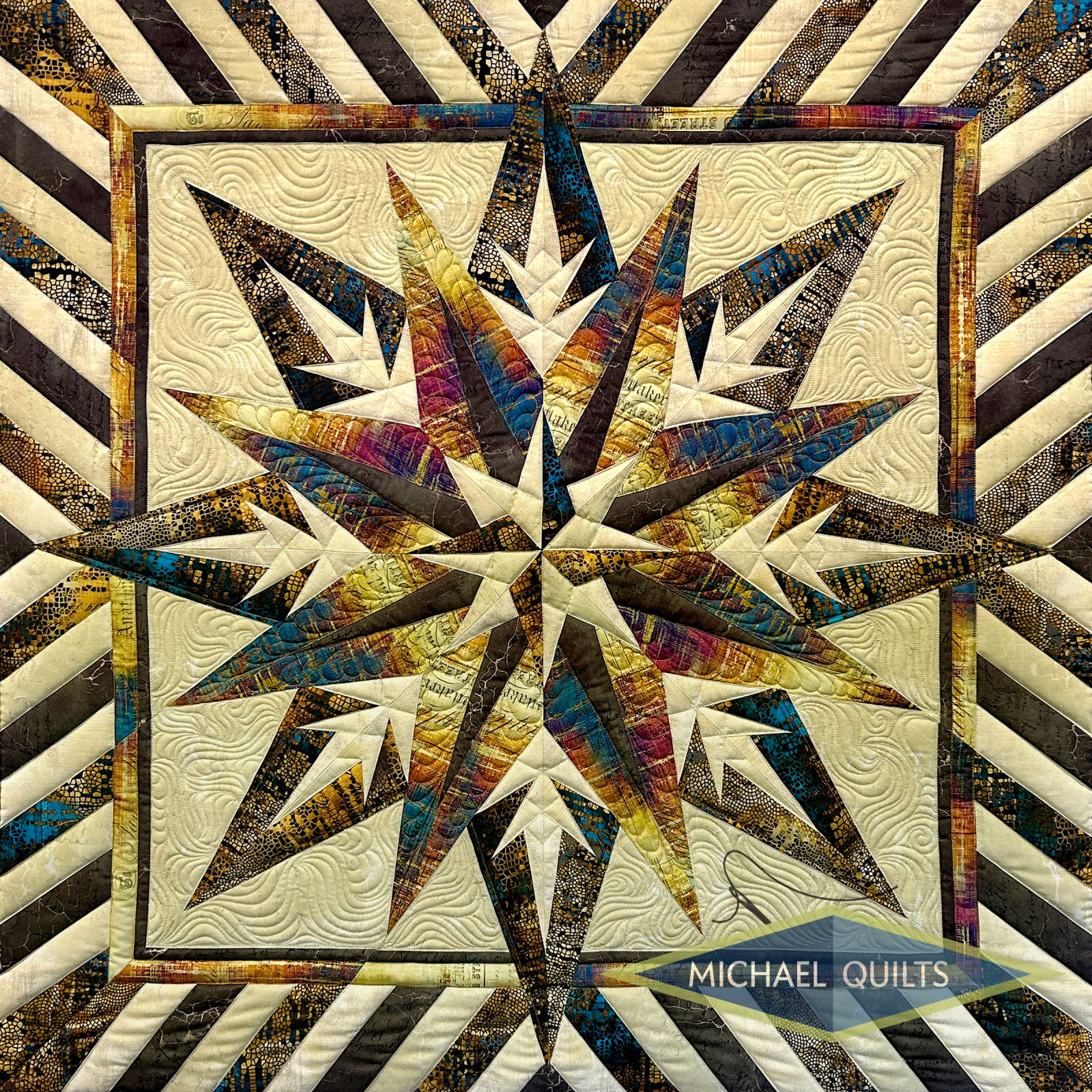TRIFARI JEWELS is a fun beginner friendly 45” x 45” pattern from Quiltworx that goes together quickly while learning and practicing Judy Niemeyer’s foundation paper piecing techniques. There are no curved seams in this project – just varying lengths of straight seams. Your points will never be cut off, due to Judy’s design process. This pattern will also be fun for seasoned Judy Niemeyer enthusiasts that like showing off interesting color choices! The amazing Tim Holtz Abandoned fabrics lend themselves to creating interesting color and texture motifs which will appear to make the quilt much more complicated than it is! Fabrics are various Tim Holtz prints from Free Spirit Fabrics.