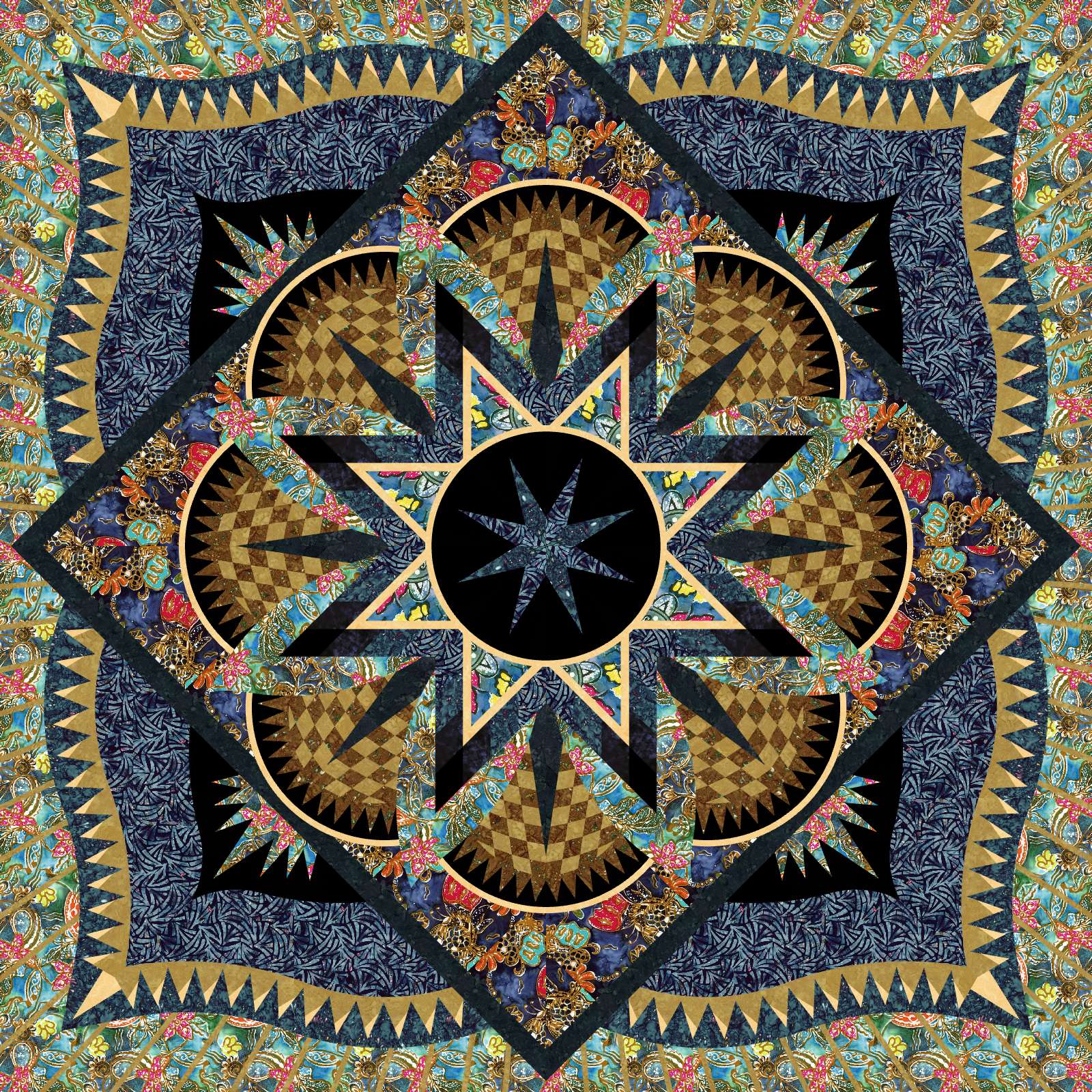 The Artisan Traditions is a foundation paper pieced pattern by Quiltworx.com. It is shown here in one of the original colorways featured in the pattern using Expressions Batiks from Riley Blake. The colorway was created by Judel Niemeyer in Quiltster. The kit includes 21-5/8 yards of fabric, including the binding and can be purchased with or without the pattern.