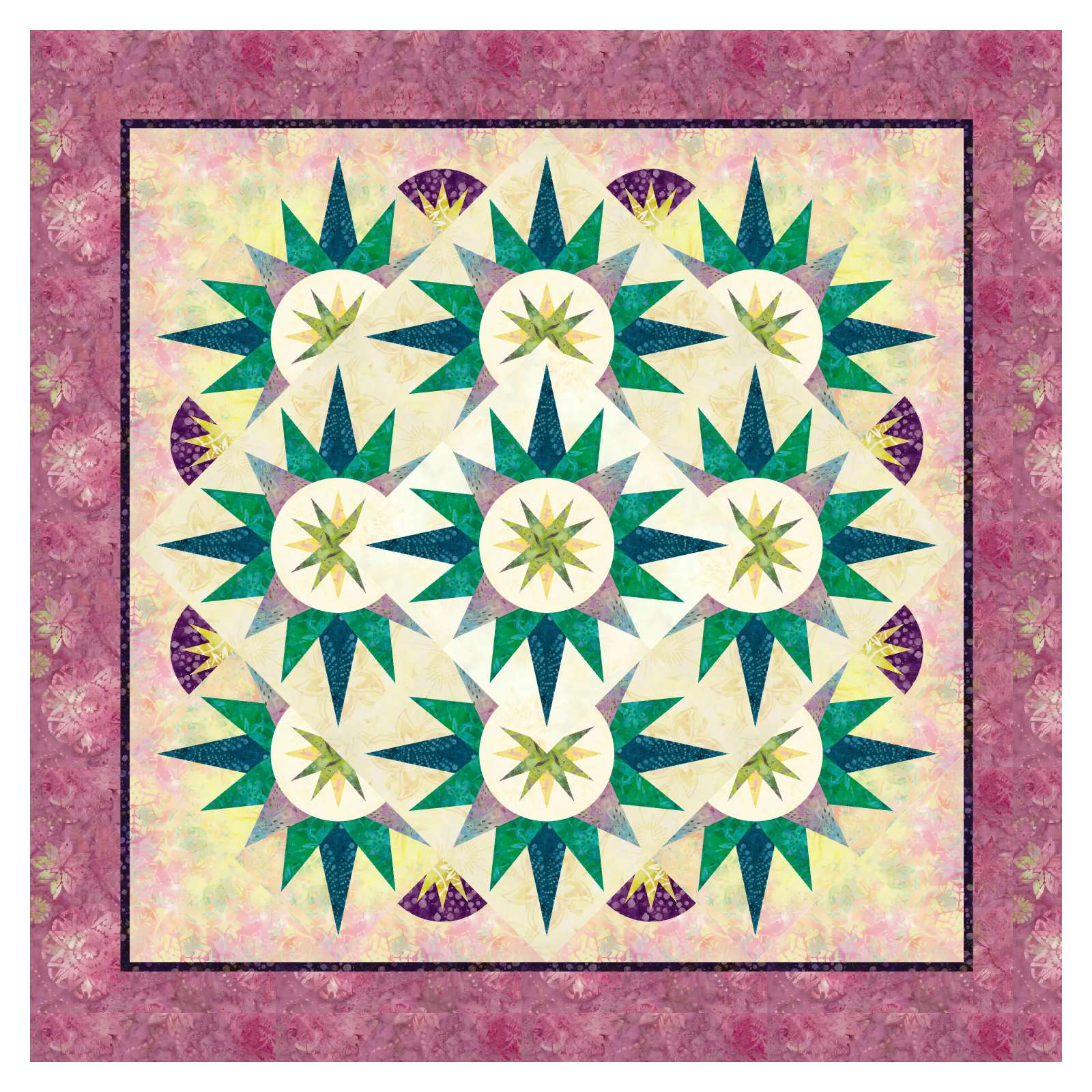 The Arizona Cactus in Valley Blossoms kit is a foundation paper pieced pattern by Quiltworx.com. This kit was created by Judel Niemeyer in Quiltster using 5-1/2 yards of Timeless Treasures's Tonga Valley Blossoms fabric line. This kit includes the binding and can by purchased with or without the pattern.