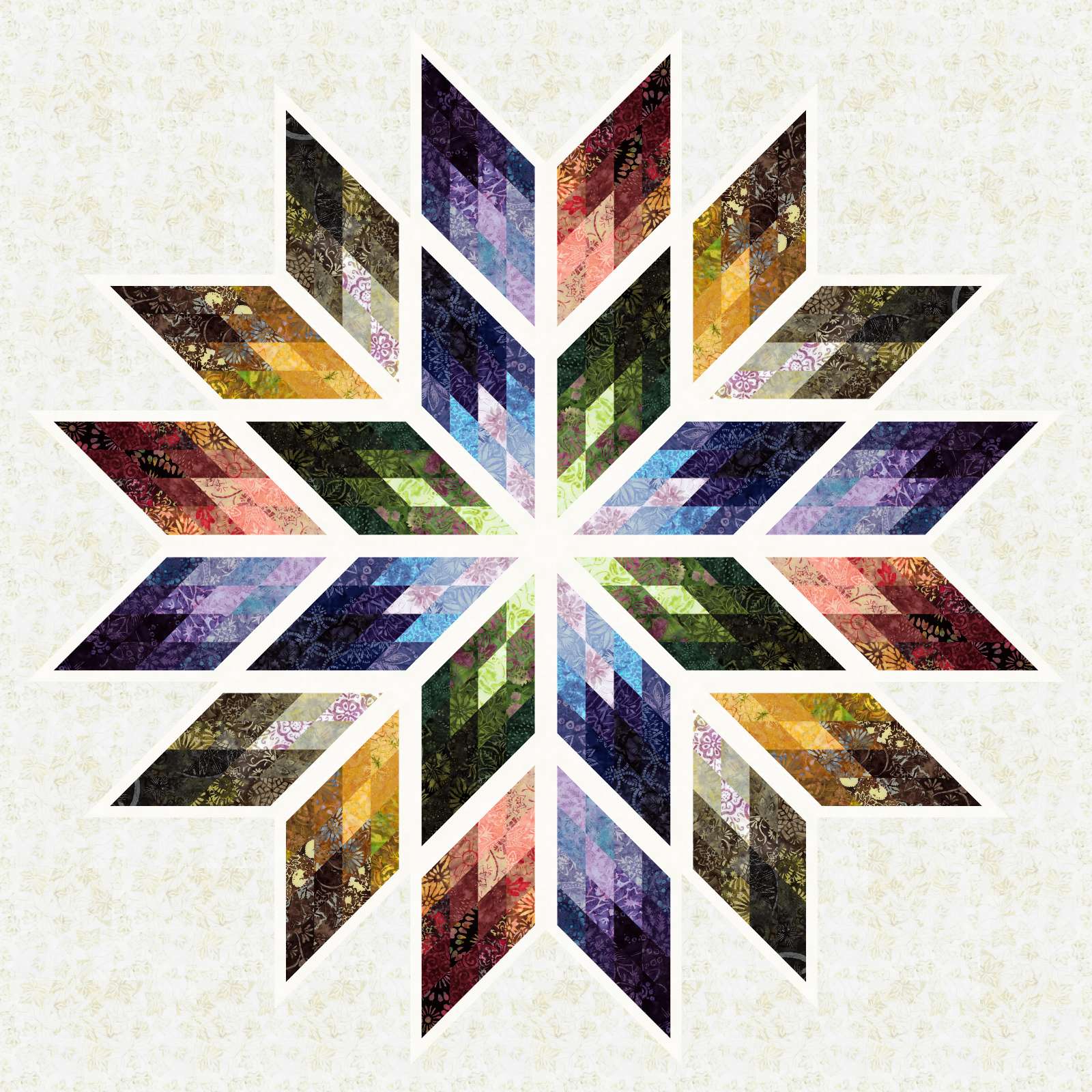 The Prismatic Star kit is a foundation paper pieced pattern by Quiltworx.com. This kit was created by Judel Niemeyer in Quiltster using 4 - 1/4 total yards of Timeless Treasures' Apple Cider Quiltworx Strip Set, which includes 48 2.5in strips sorted from light to dark into 6 groups of 8. This kit can be purchased with or without the pattern and includes the binding.