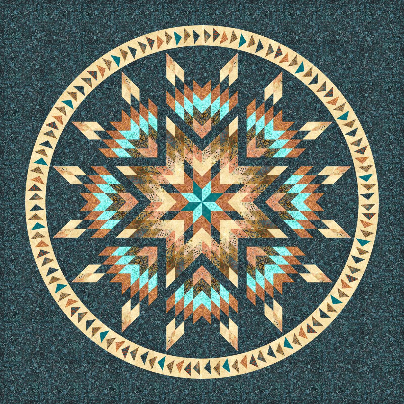 Lakeshore Sunrise: Golden Mesa Colorway Kit inlcudes: Fabric for quilt top including binding and pattern depending on option selected Finished size: 80" sq Backing not included: need 7 1/2yd or 2 1/2yd of a wide backing or 90" cuddle fabric