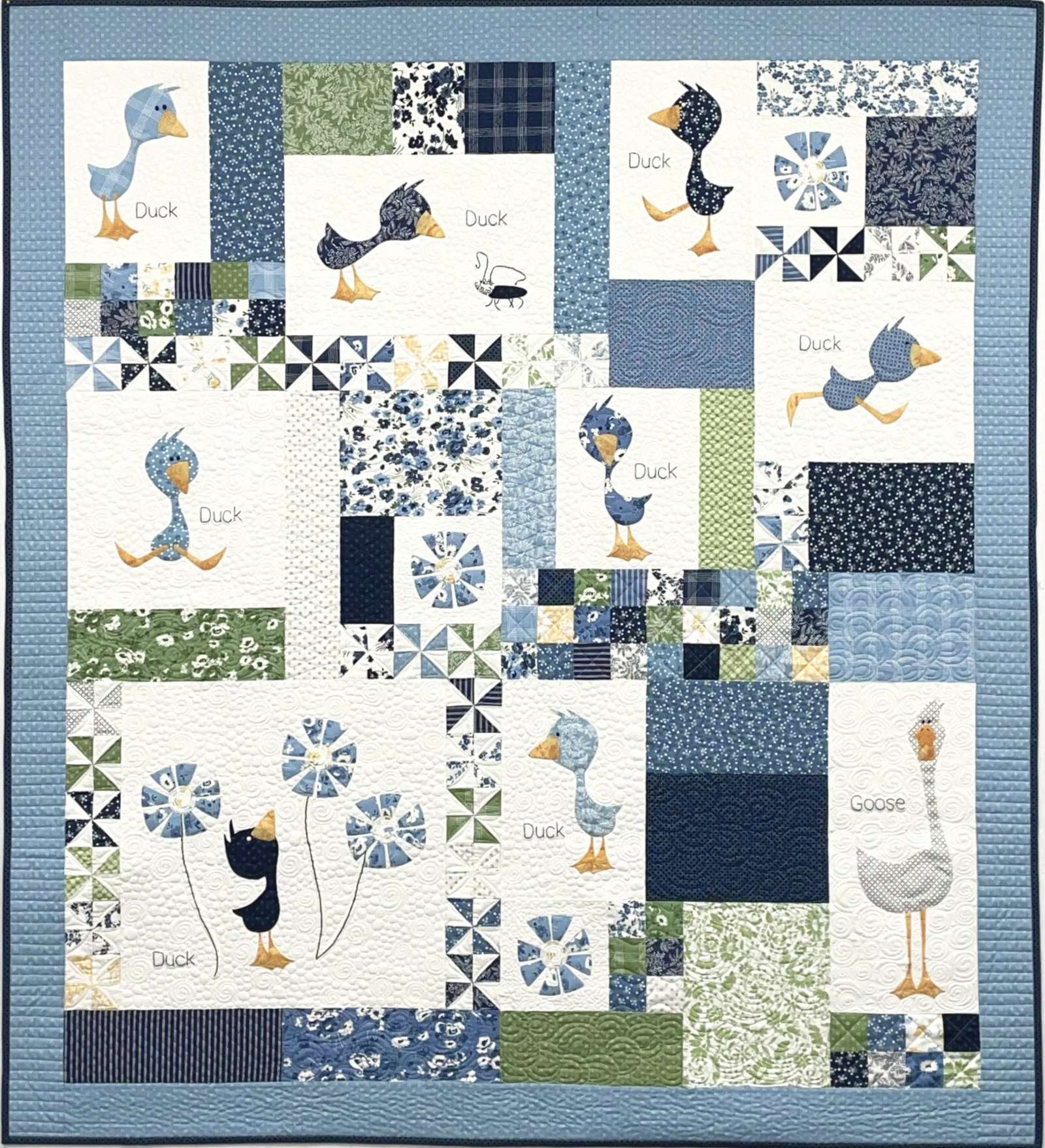 Traditional Pieced and laser cut raw edge applique quilt kit. Duck Duck Goose 3.0 BOM Full Kit Includes: Pattern, pre-fused Laser Cut applique pieces, & Fabric to complete quilt top including binding. Finished size: 56" x 62" This has been one of the our all time favorite kits and Moda has decided to re-print the Nantucket Collection!!! So we have kitted up this amazing quilt again and of course it will be with laser cut applique to make this a fun and fast applique quilt. Because this is a re-cut kit your kit will have additional fabrics to those that are pictured in the original quilt pic. Additional Materials needed: Embroidery Floss, 3 1/2 yd backing