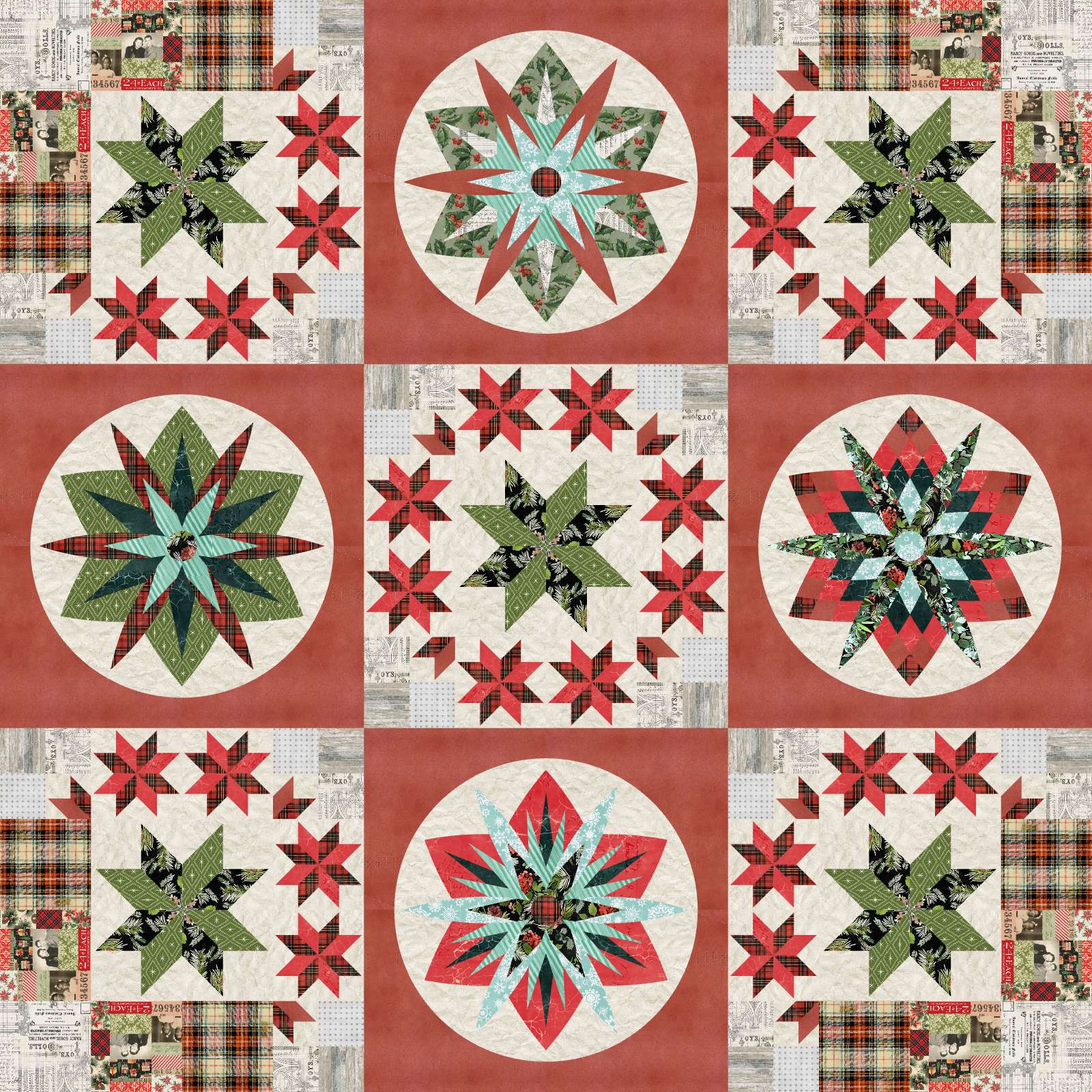 Home for the Holidays is a foundation paper pieced pattern by Quiltworx.com.  The colorway was created using fabrics designed by Tim Holtz.  The kit includes 15-1/2 yards of fabric, including the binding, and the kit can be purchased with or without the pattern.