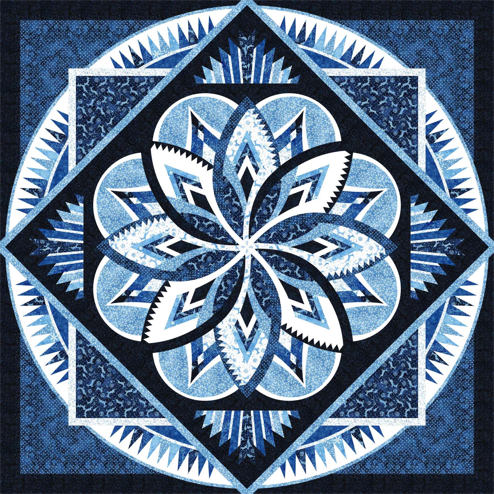 Peppermint Twist is a foundation paper pieced pattern by Quiltowrx.com. This kit includes fabrics from an assortment of Island Batik Christmas Collections in Blues and whites for a frosty holiday themed feel. The quilt includes 22-1/2 yards of fabric, including the binding, and can be purchased with or without the pattern. Note that if purchased without the pattern, you will need the Peppermint Twist design plus the Cogs and Blocks Border to complete the quilt. The Cogs and Blocks border should be the most recent version as it has cutting instructions to reflect the colorwave of fabrics in the spikes around the border.