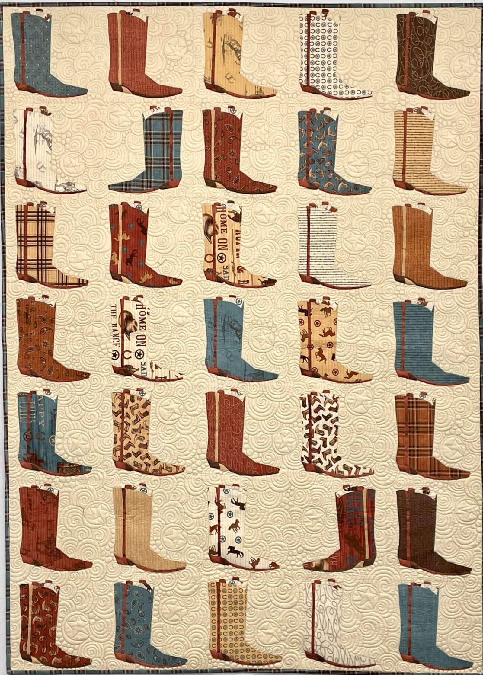 This is a Laser cut applique quilt using cotton fabrics. Bootaholic Quilt Kit includes: Fabric, Prefused Laser Cut Applique's and Pattern the complete the quilt top including binding. Finished Size: 50" x 70" Additional Materials needed: 3 1/4 backing