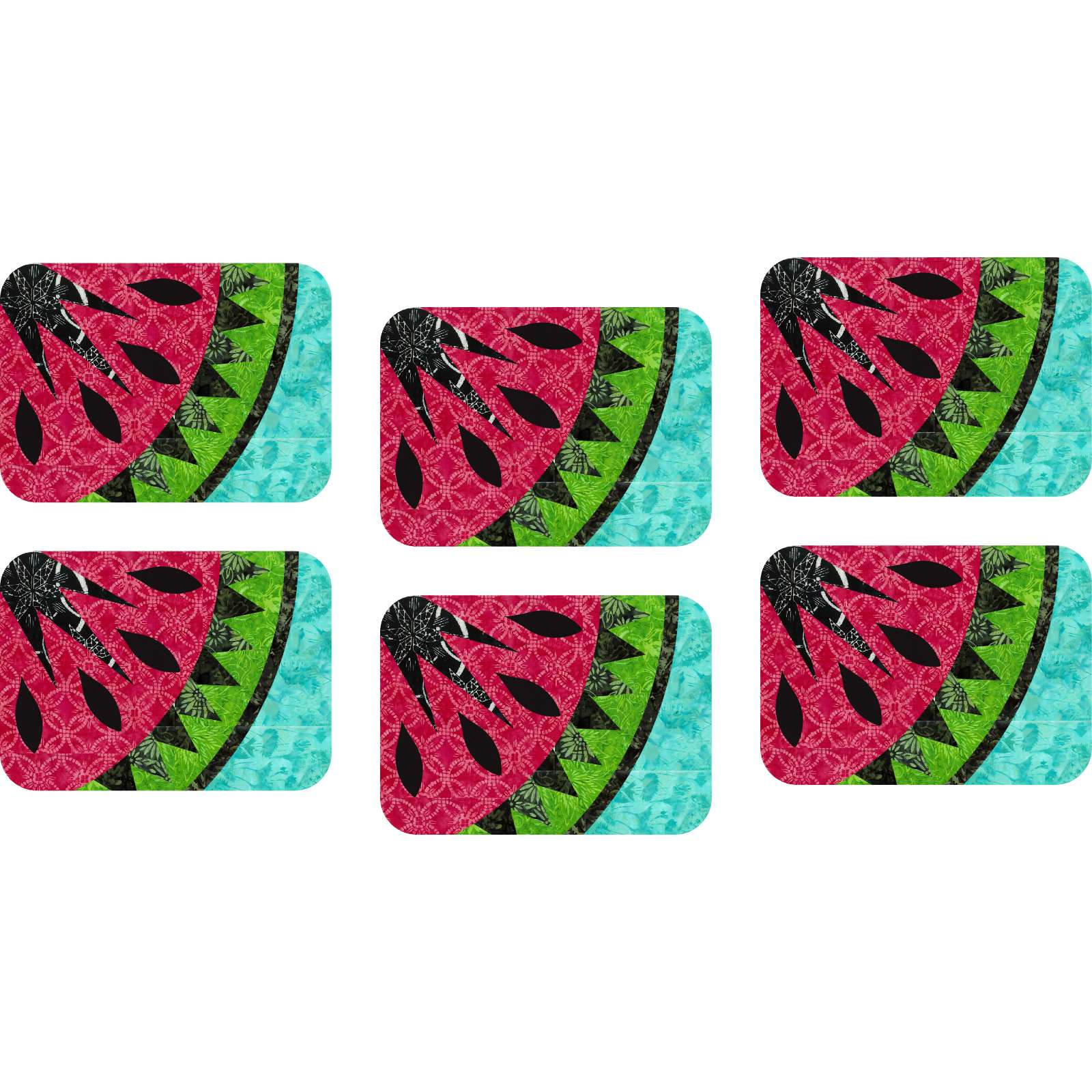 The Watermelon Placemats are designed by Quiltworx.com as foundation paper piecing patterns. This colorway was created using batiks from a variety of collections designed by Judy and Judel Niemeyer from Timeless Treasures. The kit includes 4-5/8 yards of fabric, including the binding and can be purchased with or without the pattern.
