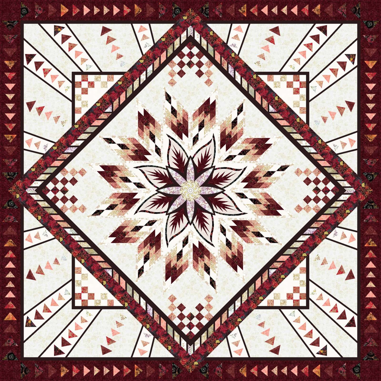 This Fancy Flamingo King kit is a foundation paper pieced pattern by Quiltworx.com that includes the pattern with an added border package to enlarge the original quilt from 80" to 118" square. It was created by Judel Niemeyer in Quiltster using 28 yards of Timeless Treasures' Apple Basket fabric line. It includes the binding and can only be purchased with the pattern.
