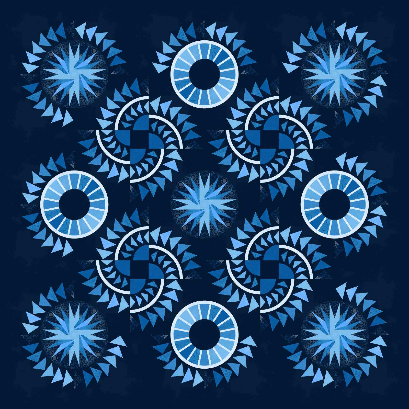Riptides is a foundation paper pieced pattern by Quiltworx. This kit was created by Judel Niemeyer using fabrics from the ColorStock Cotton Basics collection designed by Judy and Judel Niemeyer with Timeless Treasures. The kits include 14-3/8 yards of fabric, including the binding and can be purchased with or without the pattern.