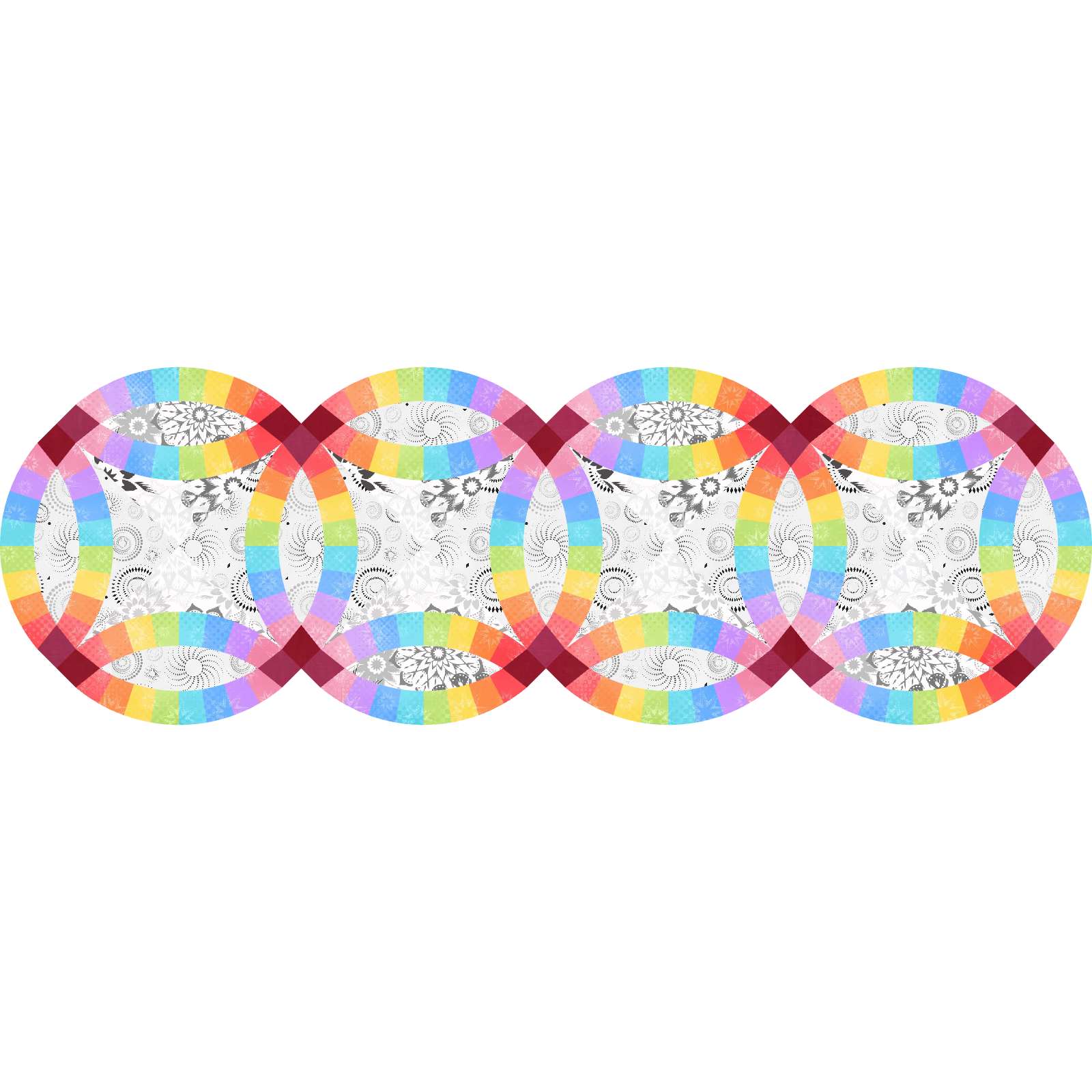 The Wedding Ring Table Runner is a foundation paper pieced pattern by Quiltworx.com.  This design is featured in the Quarter 1 2026 Box Program.  And, a workshop will be held on April 8th on the Quiltworx Youtube Channel to teach you how to make it.  The fabric shown here is from the ColorStock Collection designed by Judy and Judel Niemeyer.  There is 2-1/3 yards of fabric included, which includes the binding, and it can be purchased with or without the pattern.