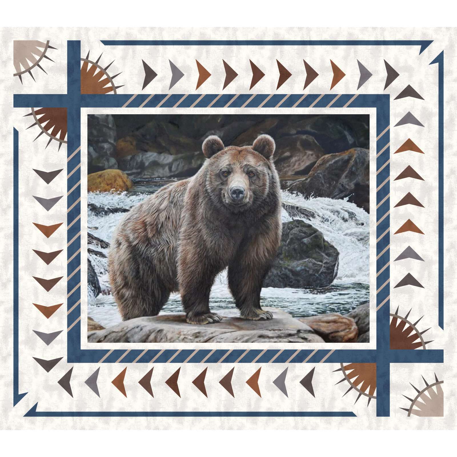 The Alpine Tracks Panel Quilt is a foundation paper pieced panel border design by Quiltworx.com. This design is paired here with the Majestic By Nature, No Fish Today panel created by Riley Blake Designs. We have 20 kits available in the cover colorway, using Shabby basics from Riley Blake, designed by Lori Holt. The panel includes 6-3/8 yards of fabric for the panel border, plus the 36" x 43-1/2" bear panel. It can be purchased with or without the pattern and includes binding. The pattern included can be made to different sizes. The finished size of this project will be 60" x 68". While supplies last, the Bear Panel is included for FREE! Thank you, Riley Blake for helping us launch our panel border series with such a fun project!