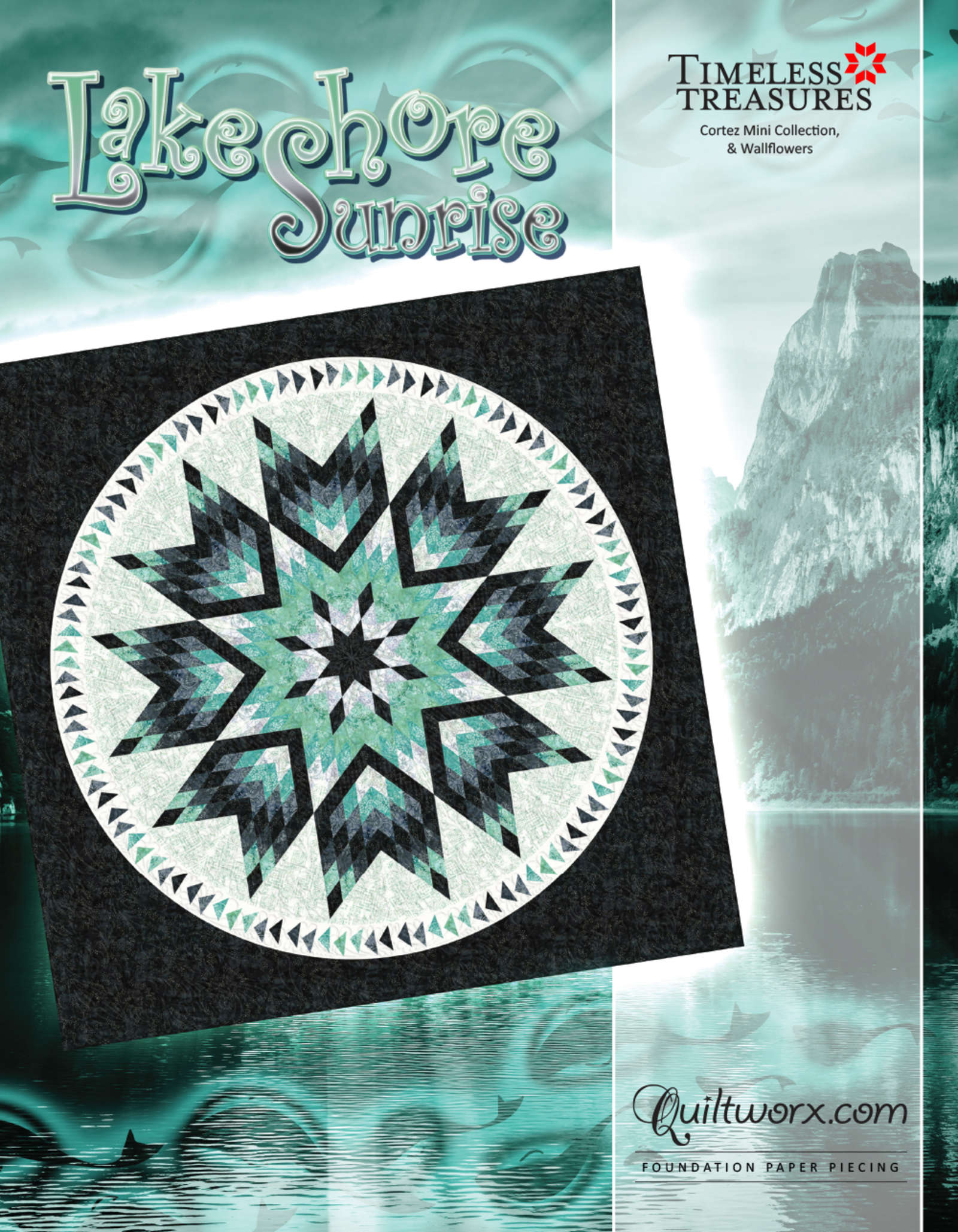 The Lakeshore Sunrise pattern was designed after the Prismatic Star, adding a border, and setting the stage for a wide range of quilt sizes that feature the exploded lone star design. The paper pieced block uses 2-1/2″ strips, which are sewn onto foundation paper to complete what we call a Foundation Sheet, which are then cut apart, rearranged and resewn into a diamond star point. A circling geese block was designed to frame the exploded star and a large open background was added to showcase quilting designs. The papers were designed by Judy and Bradley Niemeyer from Quiltworx.com and the quilt on the cover uses a color palette of batiks designed by Judy and Judel Niemeyer called the Cortez Mini Collection by Timeless Treasures. This is the 2nd version of this pattern.