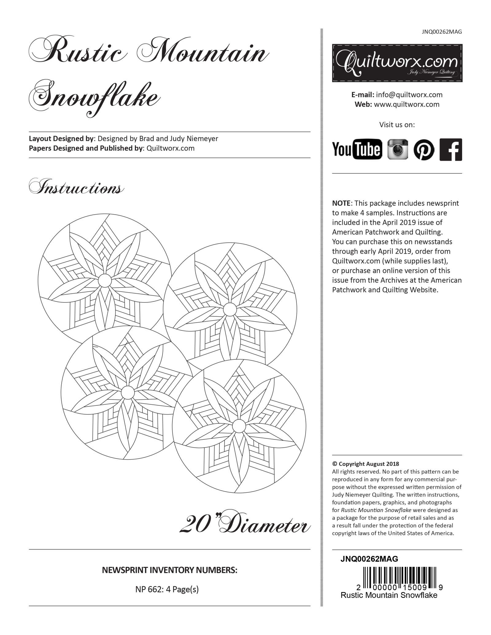 Featured in the April edition of American Patchwork & Quilting, the Rustic Mountain Snowflake is a seasonal table topper (or placemat) designed by Quiltworx.com to introduce quilters to paper piecing. While the magazine comes with the pattern and papers for (1) table topper (which can be photocopied), you can order the set of 4 here for $10.99 or your favorite quilt shop for a limited time. The package will have enough foundation papers to make (4) snowflakes and will include an insert with yardage and cutting information to make all (4) snowflakes at the same time. Please note, the pattern instructions are only available in the April edition of APQ. Quiltworx will have a limited supply of the magazine once they arrive.