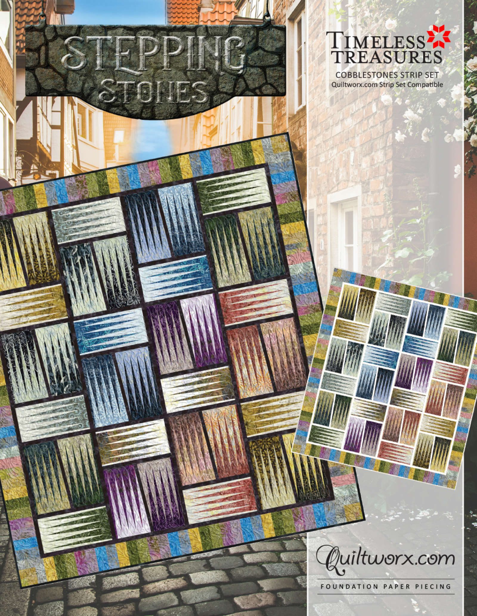 The Stepping Stones shown on the cover is the latest update to a very popular pattern designed by Judy and Brad Niemeyer several years ago. Paper piecing and traditional piecing techniques are required to assemble this quilt. The pattern teaches a simple concept using two strips of fabric to create one appealing block design. This quilt was designed as a fun and fast quilt for all skill levels of quilters and is very fast to complete. Customize the colorway for Stepping Stones in Quiltster to see the look of your finished quilt and get a yardage chart before you make it!