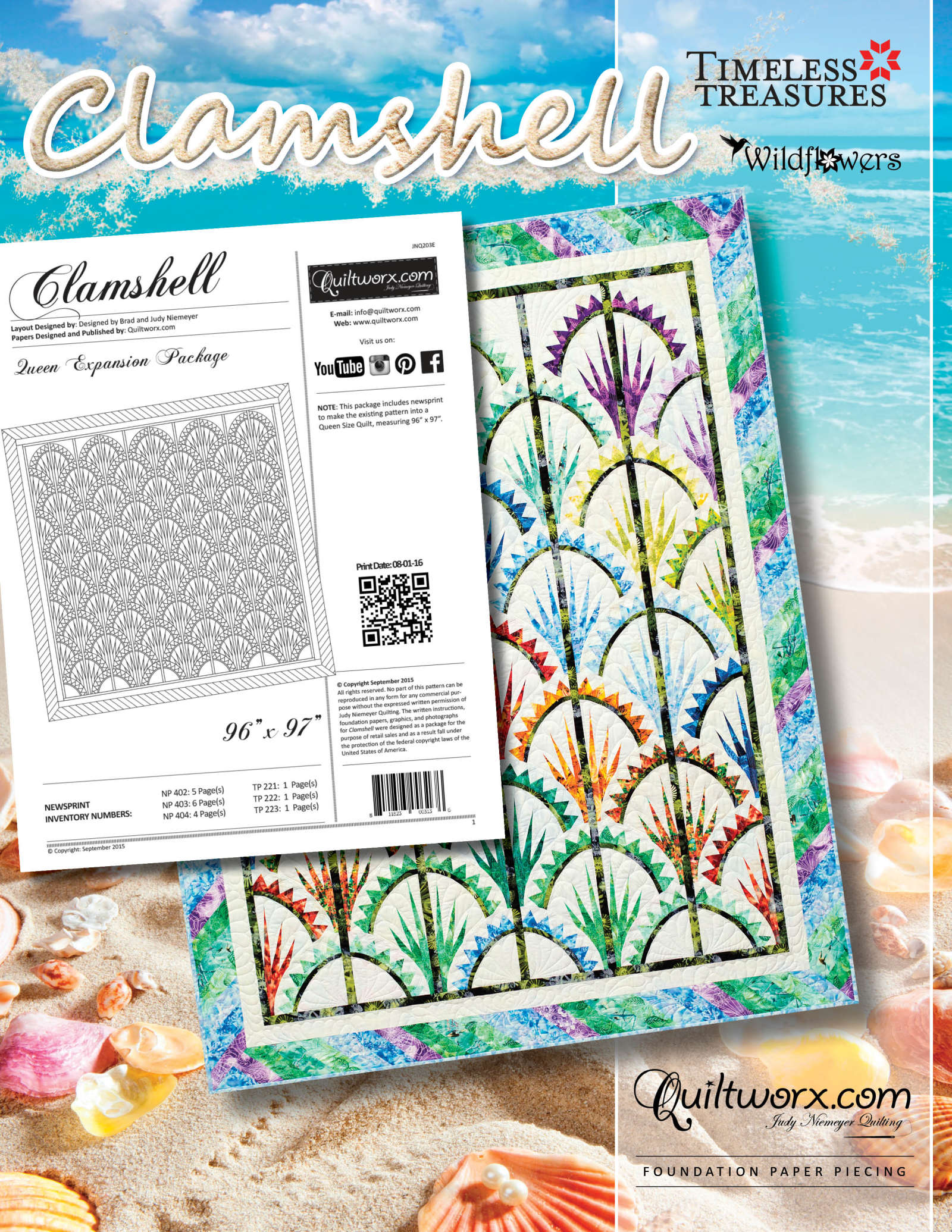 The Clamshell Queen requires purchase of the Clamshell pattern and the Clamshell Queen Expansion package. The pattern requires paper piecing, curved paper piecing, and traditional assembly skills. Open the layout in Quiltster to audition fabrics for your Clamshell quilt.
