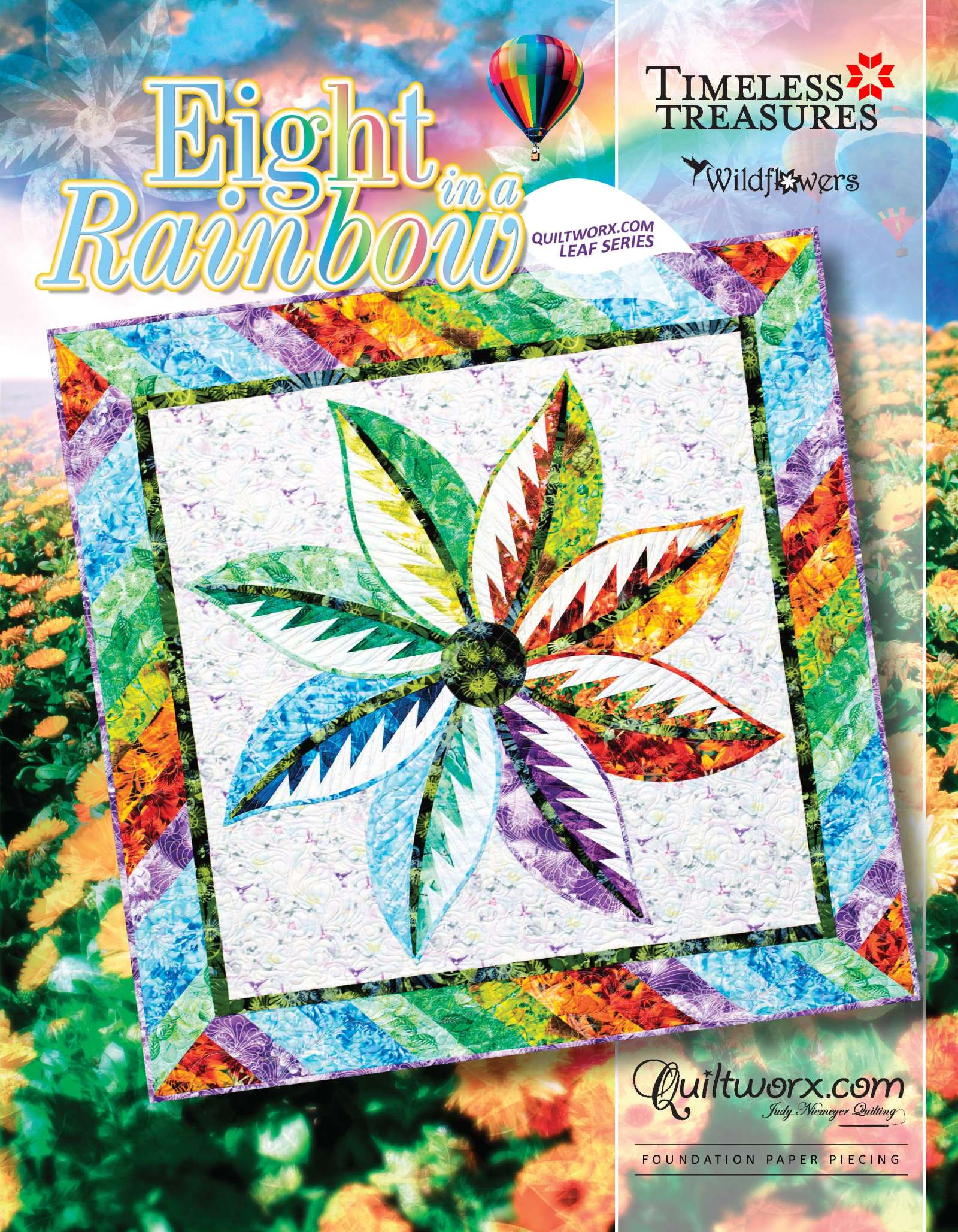 Judy, Judel and Brad Niemeyer designed the layout, instructions, and foundation papers for Eight: In a Rainbow, which is a pattern in the Quiltworx.com Leaf Series. The Leaf Series is a collection of patterns designed to teach quilters some of Judy’s latest techniques, including curved paper piecing and appliqué of paper pieced units. A collection of fabrics designed by Judy and Judel Niemeyer called Wildflowers, by Timeless Treasures were selected to make the sample shown on the cover. The pattern was published in 2014 in another collection called Reclaimed West. This latest publication includes a bright and colorful strip paper pieced border. A sewing technique called foundation paper piecing is used to assemble the units required to make this quilt. Curved piecing, traditional piecing, and appliqué are used to assemble the wall hanging after the foundation piecing is completed.