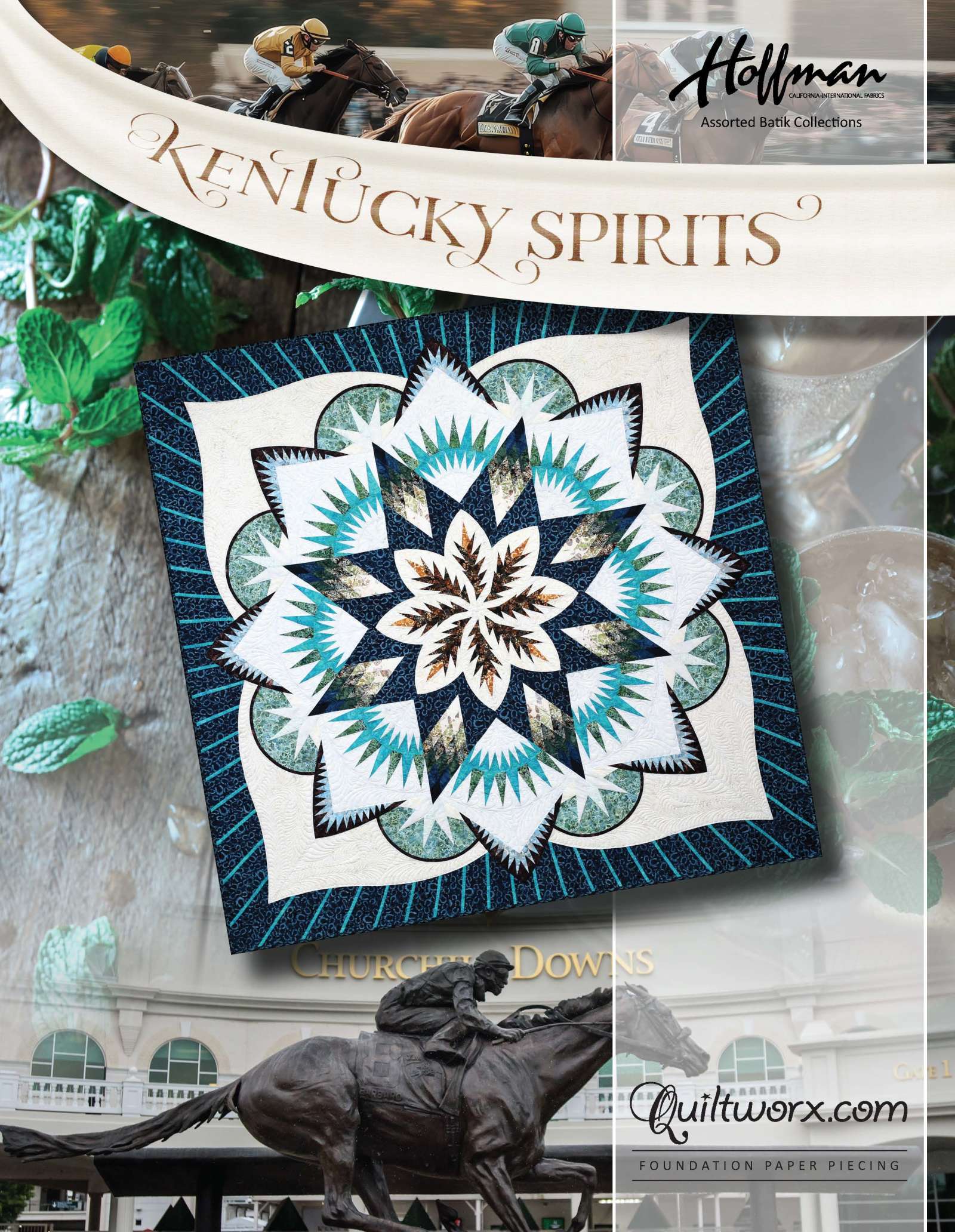 Kentucky Spirits is a 99 inch square design created using mixer blocks from the Meadow Star Mixer Series, designed by Quiltworx.com. The pattern uses paper piecing and traditional piecing techniques to assemble. The pattern includes all of the paper piecing foundation papers and cutting templates and an instruction booklet.