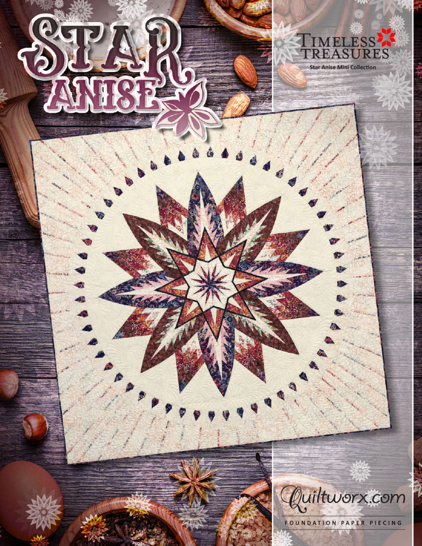 Star Anise is a Foundation Paper Pieced Quilt pattern designed by Quiltworx.com. It uses elements from the Sunrise Mixer Series and was designed to showcase the Star Anise Tonga Batik Mini Collection Designed by Judy and Judel Niemeyer, from Timeless Treasures. The pattern is a collectors club design and as such, only 500 patterns are available. If you are interested in a Kit in the original colorway, please check with your local Quilt Shop or in the Quiltster Marketplace. 30 Kits have been prepared for interested quilters. The quilt finishes to 80" Square and at present, there is not an expansion package to make it larger.