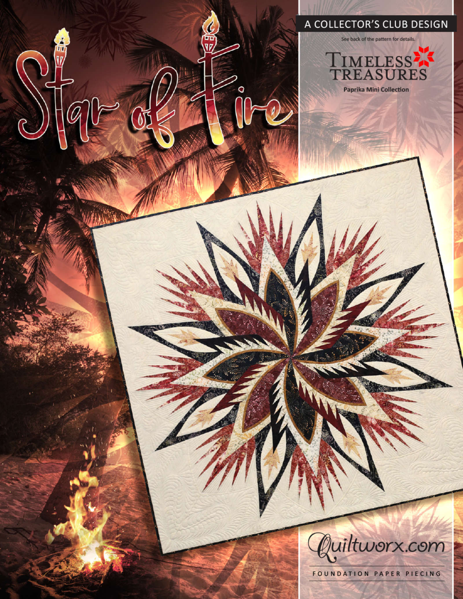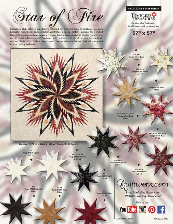 Star of Fire is constructed using four distinct sections: Group J is comprised of (8) center diamonds; Groups K and L radiate out from the center star in two additional rounds of (8) star points each; and Group B is a pieced border added to the rounds resulting in a 57″-square quilt. The quilt blocks were designed by Judy and Bradley Niemeyer. The layout and colorway was created by Judel Niemeyer using Quiltster. This pattern is a Collector’s Club Design, which means a limited number of patterns were published to celebrate the release of a Judy and Judel Niemeyer Tonga Batik Mini Collection that was used to make the quilt on the cover sheet. Generally, the number of patterns published is 500. Replacement papers are not available as these patterns are only published in limited numbers. When the patterns are sold out, they will not be re-printed. Get your copy today! There are many ways to expand your Quiltworx designs into larger sizes with compatible border packages by clicking the Buy Now button. If listed, you should purchase the Introduction Booklet for the size quilt you want. Then, you should select expansion borders of your choice. The following information explains ways to expand your quilt. To expand this to a 68″ Wall Quilt, add a 242C border of your choice listed under the Buy Now Button. To expand the 68″ to a 99″ Queen, purchase one of the 242D borders listed under the Buy Now button