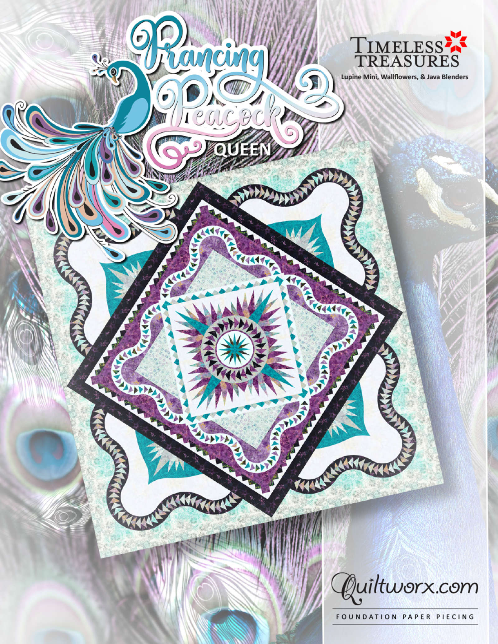 The Prancing Peacock Queen is a Queen Size Foundation paper pieced pattern by Quiltworx.com. The quilt top finishes to 99" square.