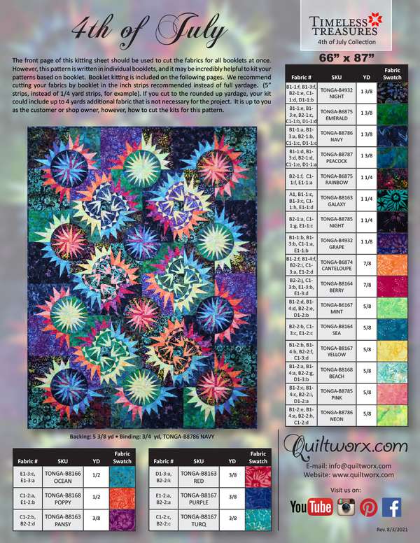 The 4th of July is a Foundation Paper pieced pattern by Quiltworx.com. The pattern is meant to be a scrappy, colorful, explosion of color, and is a block inspired pattern. The main quilt finishes to 66" x 87", which is a Twin Size Design. An expansion package is coming soon (expected end of August 2021) that includes enough papers to take the quilt to a Queen or King Size design. A separate pattern will be available in Quiltster to color those increased sizes.