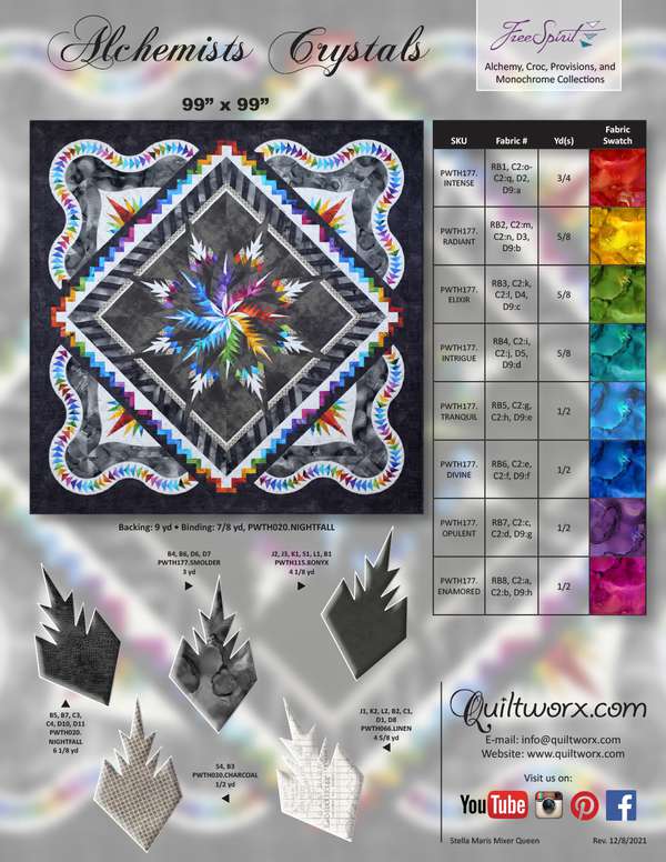 Alchemists Crystals is a foundation paper pieced design by Quiltworx.com. The quilt finishes to 99" Square. It is designed with special cutting instructions to achieve the rainbow layout of the fabrics shown on the cover. Take your quilt planning to the next level and become a member to customize this pattern in the Quilt Planner or just grab the pattern here and have it shipped to your door!