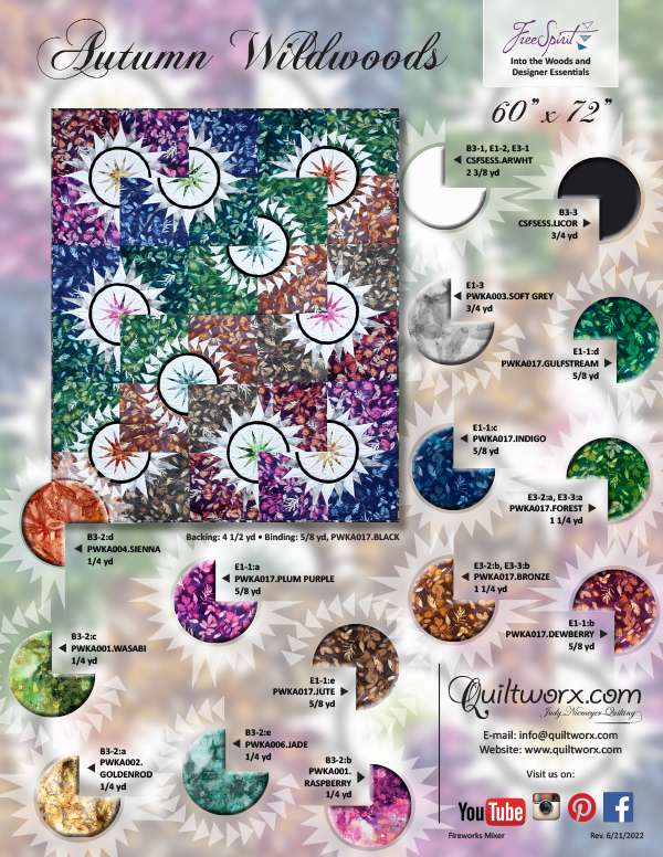 Autumn Wildwoods in a Foundation Paper Pieced design by Quitlworx.com. This pattern includes finishes to 60" x 72", which makes a great twin size project. It can be expanded to larger sizes. In Quiltster, you can find separate layouts to make this quilt into a Queen size layout (84" x 96") and also a king size layout (108" x 120"). Information on extra foundation paper packages needed to get to those sizes are included in the descriptions for each.
