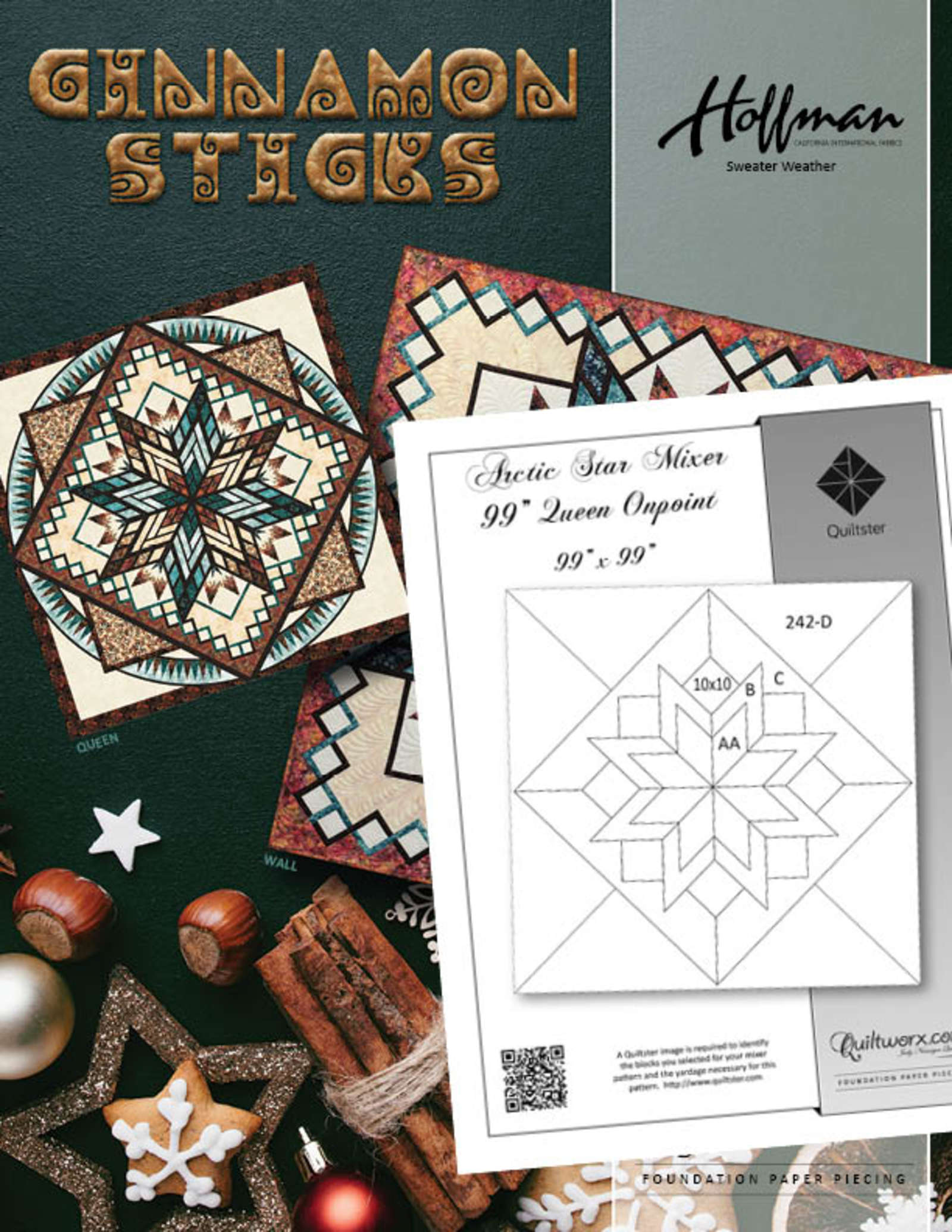 Cinnamon Sticks Queen is a foundation paper pieced pattern by Quiltworx.com. In this layout, you will get the Cinnamon Sticks pattern, which finishes to 68" squared, then you can select your choice of Queen Size on-point borders that are available as part of this layout. The quilt finishes to 99" square and cannot be increased in size with paper piecing beyond this size. Instead, you would need to purchase additional fabric in the border color and add another border to get larger. If you would like a paper pieced king option, in 2023, we will publish a series of intermediate borders to bring the 68" quilt up to 80", then you will be able to add one of our 80" to 118" king size borders. Watch for this option if this is the size quilt you would like to make.