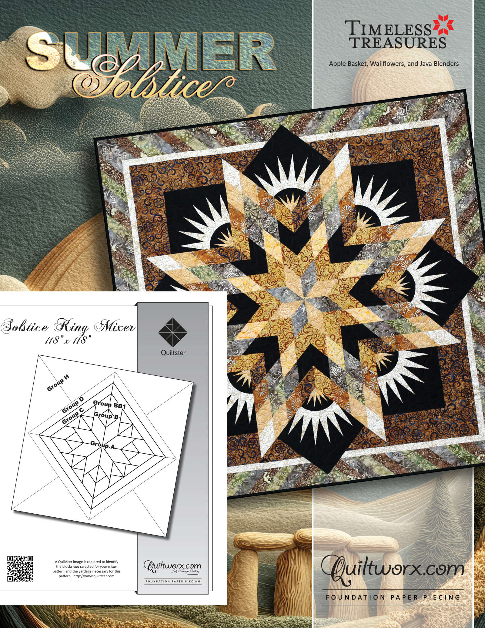 The Summer Solstice Wall pattern is a popular foundation paper piecing package by Quiltworx.com. The latest version of the pattern (using the cover quilt shown here and published in August of 2025), includes instructions that will show you how to adapt your Summer Solstice pattern to King Size. To make the transition from Wall to King, you will first need to set aside your striped C Border. You will replace that with the template included in the pattern that is discussed in the back for how to expand the quilt to larger sizes. Then, you will choose a 57" to 68" border, a 68" to 80" border, and turn the quilt on point to add the King Border of your choice. You will need to purchase the following: 1. The Summer Solstice Wall Quilt 2. A 57" to 68" 242-C Border 3. A 68" to 80" 281-D Border 4. An 80" to 118" on point King Expansion Border 277-H.