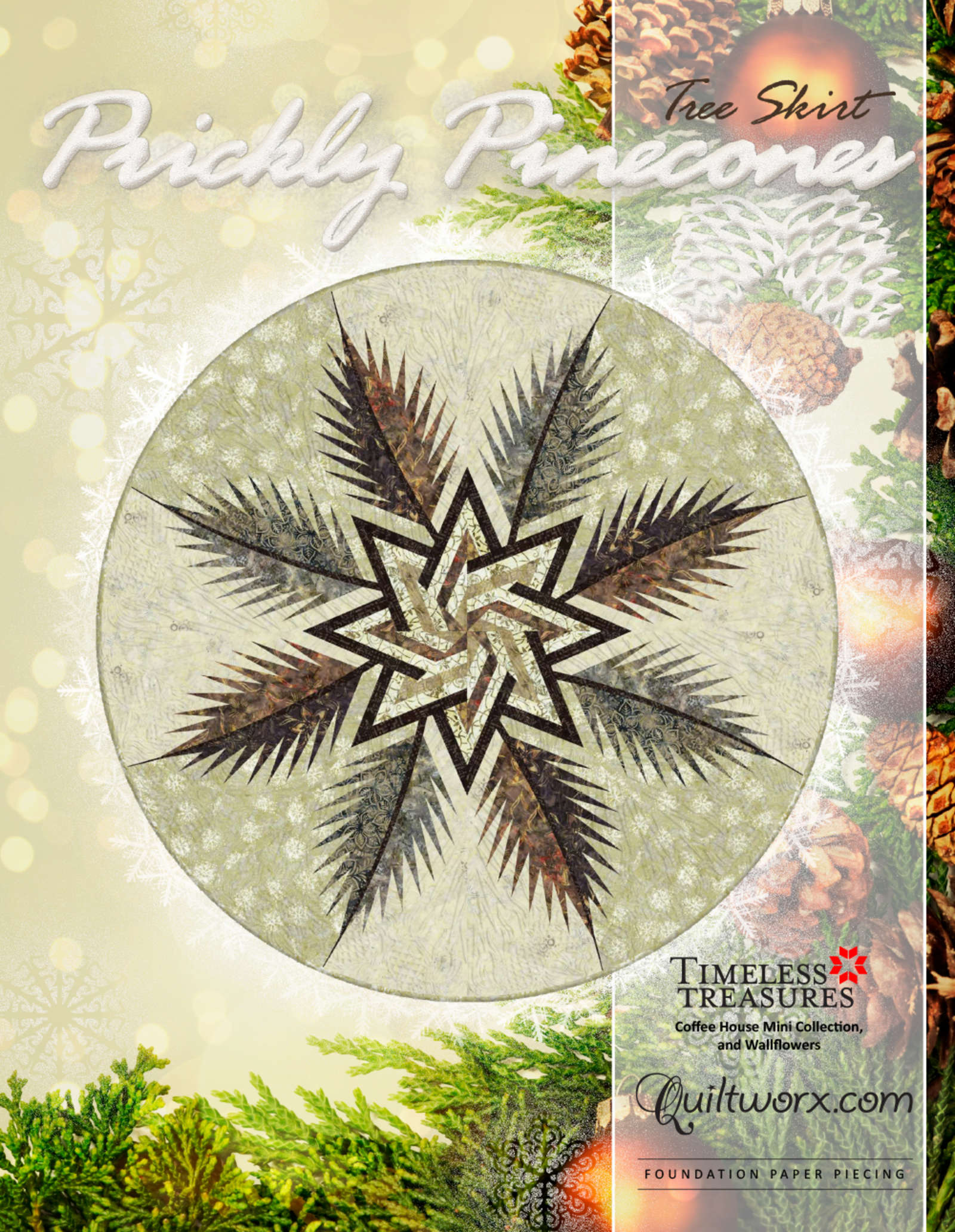 The Prickly Pinecones Tree Skirt is a foundation paper pieced pattern designed by Quiltworx.com. This design was original published in 2015, but updated in 2023. This layout for the pattern is only compatible with the 2023 pattern. In 2023, the pattern size was increased from 60" to 62" and a couple of the techniques used in the quilt were updated to current techniques. By increasing the size, it is now possible to expand the tree skirt, and add a square up border and even expansion borders to make this quilt is a variety of sizes. You can find the templates for the expansion options by clicking on the different expansion projects for Prickly Pinecones and starting a new project form there, including Prickly Pinecones 70" Expansion Tree Skirt, Prickly Pinecones 80" Square up Expansion and Prickly Pinecones King Expansion. In each option, you can choose the border of your choice for making this quilt larger. On a limited basis, you might also consider using the Pinecone Wreath Collector's Club project. Only 500 of these patterns are available and with it, you can make the 80" squared up version of Prickly Pinecones.