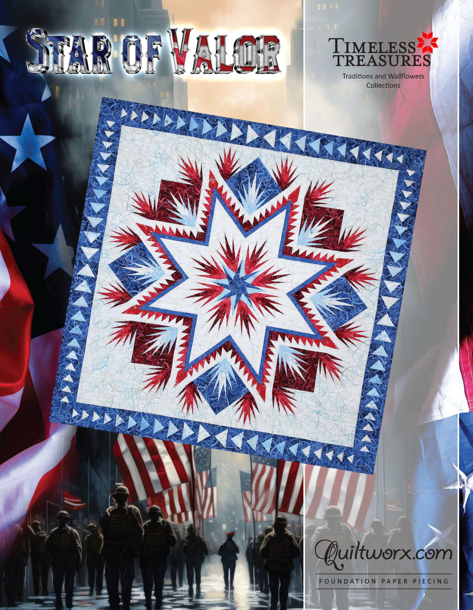 The Star of Valor is a foundation paper pieced design by Quiltworx.com. This 80 inch quilt was designed around the Tonga Batik fabric collection designed by Judy and Judel Niemeyer called Traditions, which features Red, White, Blue, and Black fabrics in a perfect assortment for creating Quilts of Valor. If you would like to make this design larger, you will find additional pattern listings for the Star of Valor King Expansion in the Quilt Patterns section. This will expand this 80" square design to 118" by turning the center on point and adding your choice of King Expansion Borders.