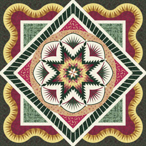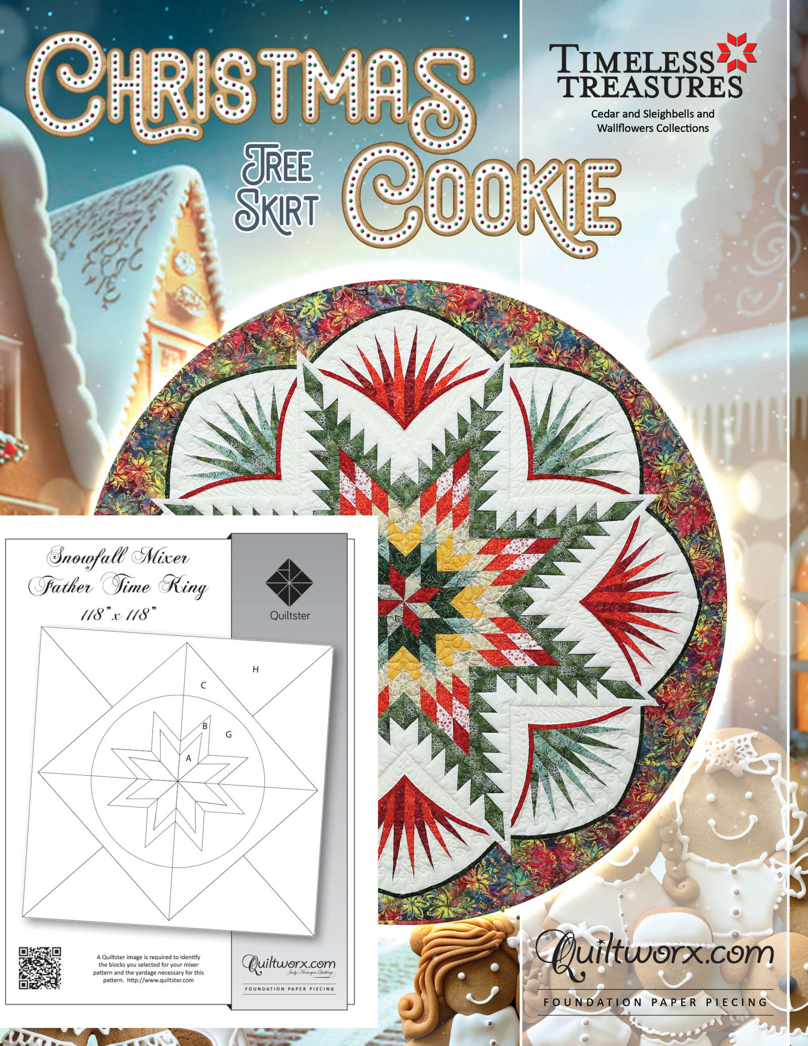 Christmas Cookie is the latest Tree Skirt designed by Quiltworx.com, using foundation paper piecing. This fun little project was inspired by a wonderful collection of Christmas Batiks from Island Batik that reminded us of gingerbread houses and beautifully decorated Christmas Cookies! This project finishes to 118" square. In this layout you can choose your own border design. To make the project shown in the pattern, choose the Bamboo Frame 80" Border, and the Dragons Tooth King Border. You can also simply choose any border you like!.