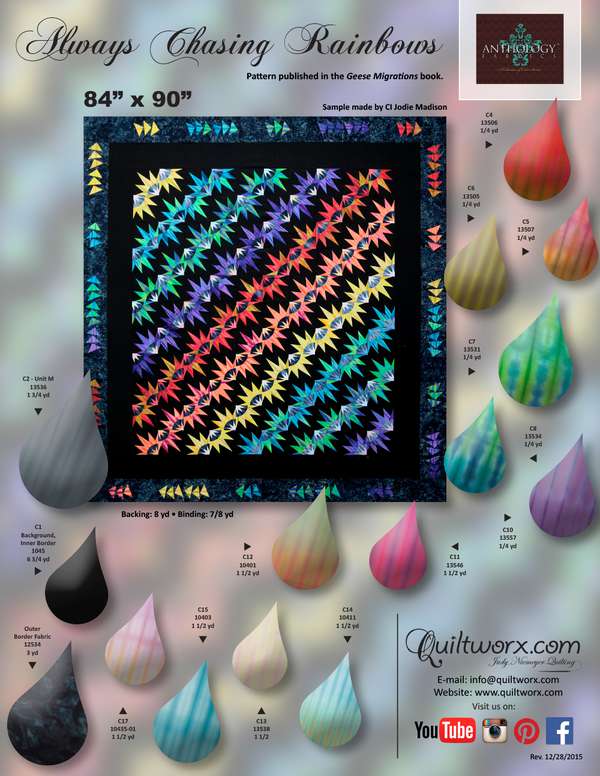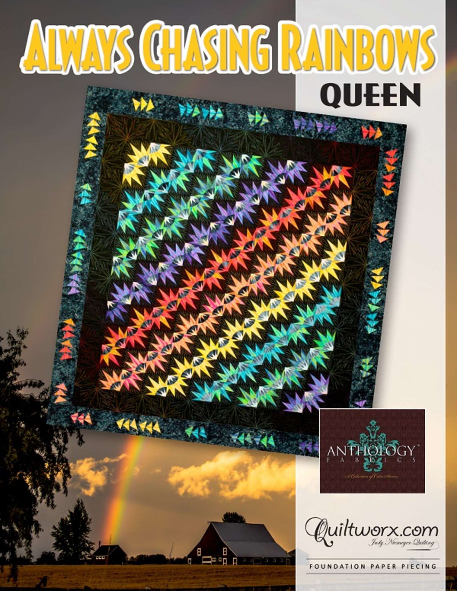 This package includes newsprint to increase the size of the Always Chasing Rainbows pattern to a QUEEN size quilt. You must purchase the newsprint for the 54 x 60 Always Chasing Rainbows in addition to this, to complete your quilt. We have added (2) additional sheets of NP 197. This is enough to make the Queen Size Quilt and (1) Table Runner per the instructions in the original pattern. It is not enough papers to make the Table Runner larger.