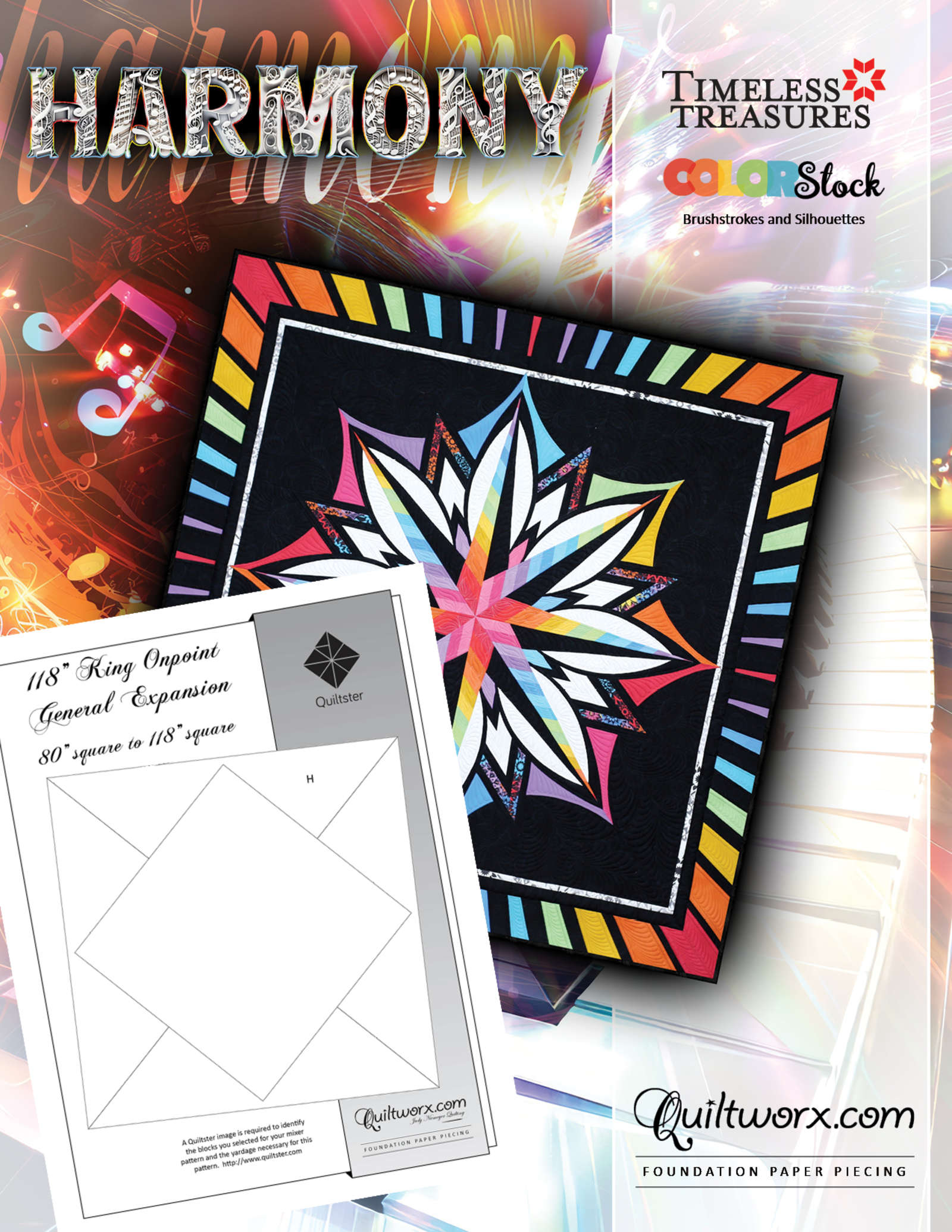 Harmony is a foundation paper pieced pattern by Quiltworx.com. This expansion will take the 80 inch quilt, turned on point, up to 118" square. You can choose the King Border of your choice and will need to purchase the original Harmony pattern, plus the King border you have chosen.