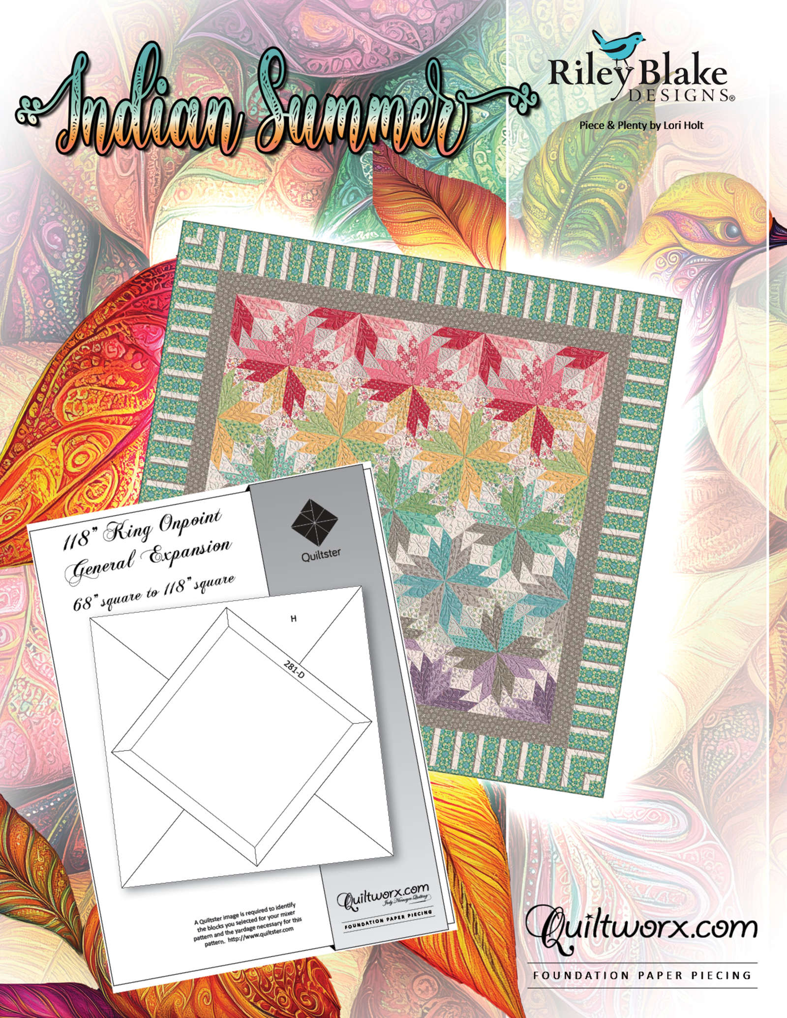 The Indian Summer is a foundation paper pieced design by Quiltworx.com. This version was a special release that uses Riley Blake fabrics designed by Lori Holt. Although the collection used was Piece and Plenty, this version will work with any of the Lori Holt collections. It requires 36 1/4 yard cuts, then the fabrics for the borders. This layout will allow you to audition borders to take this quilt to a King Size design, of 118" square. You will need to purchase the Indian Summer pattern, along with the desired border to expand the pattern to 118" square.